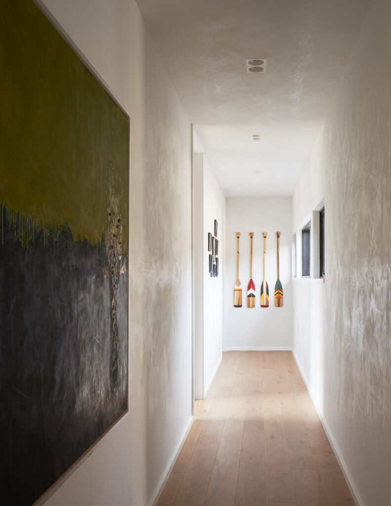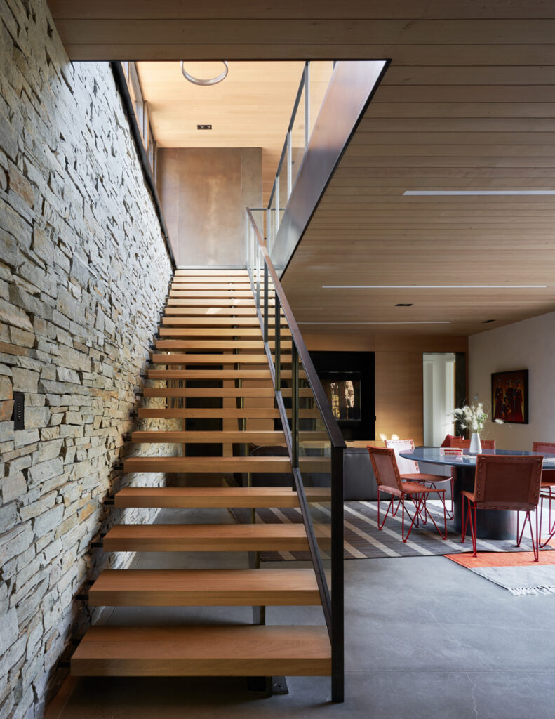 The interior design reflects the family’s personality and unique identity, while also drawing influence from the natural surroundings. Continuous hemlock soffits run from exterior to interior, with white oak and polished concrete floors in bedrooms and living areas, and dark walnut casework in the kitchen. Dry-stacked quartzite stone on interior and exterior walls completes the elemental material palette. Furnishings help bring the colors and textures of nature inside, with pops of deep reds and oranges, rich leathers, and textural rugs and fabrics conjuring an autumnal landscape palette. A deeply personal art collection unites the family’s two worlds, with pieces sourced locally and from New York City.