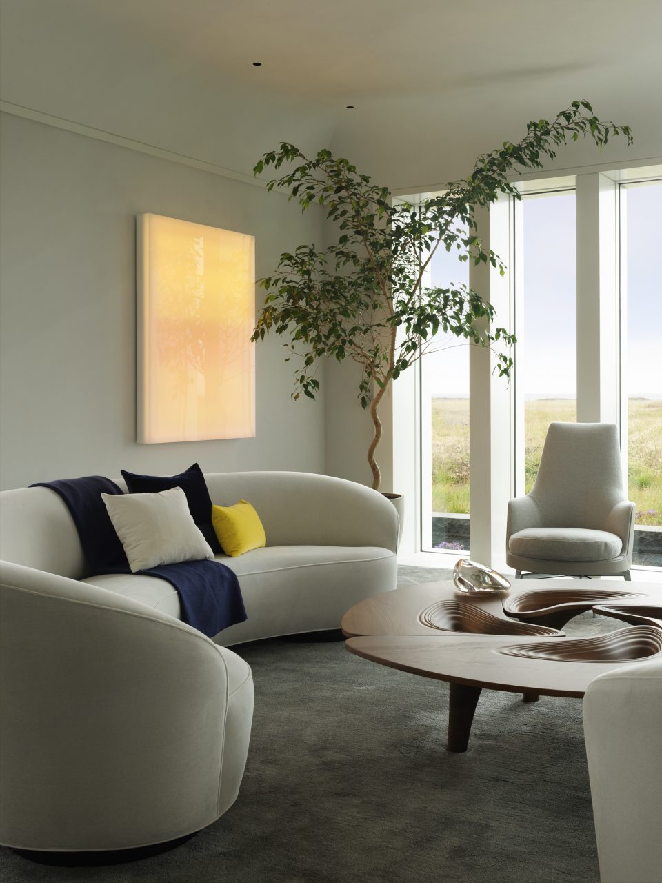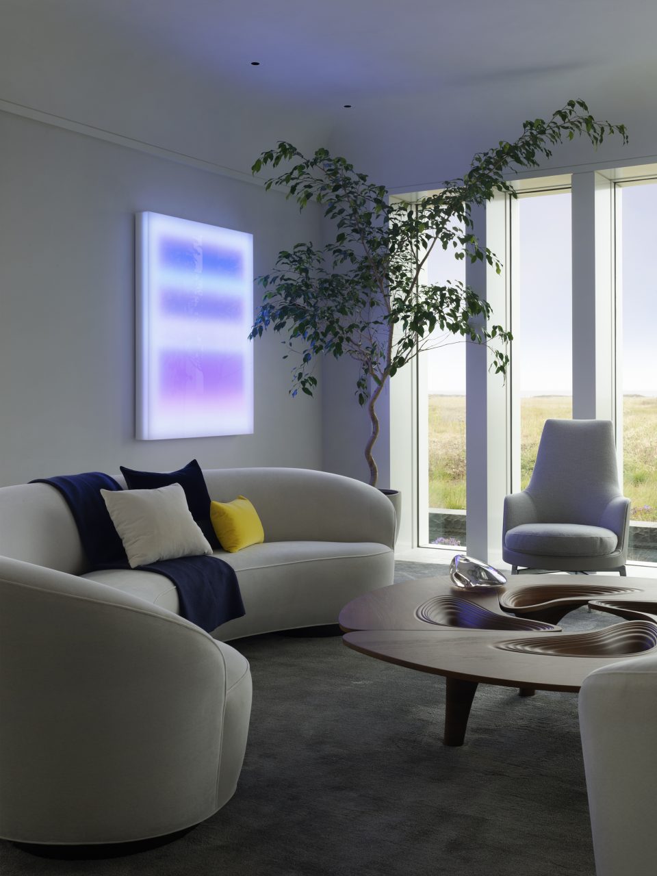 With guidance from art advisor Jacqueline Becker, the home’s collection is equally dynamic with works such as Leo Villareal’s Rothko-inspired LED light installation, which bathes the living room in revolving shades of sunrise yellows to twilight blues.