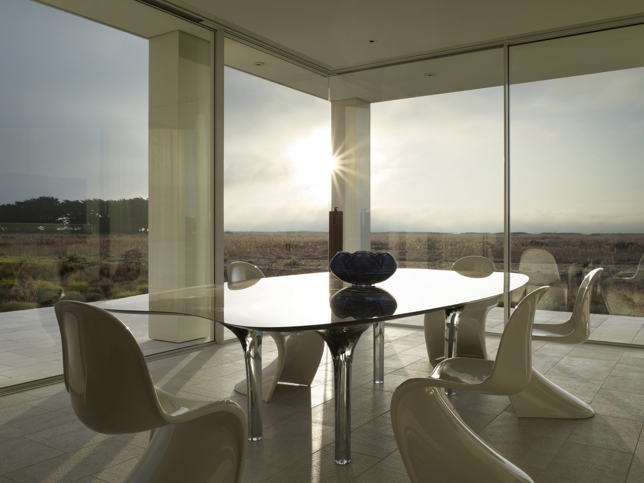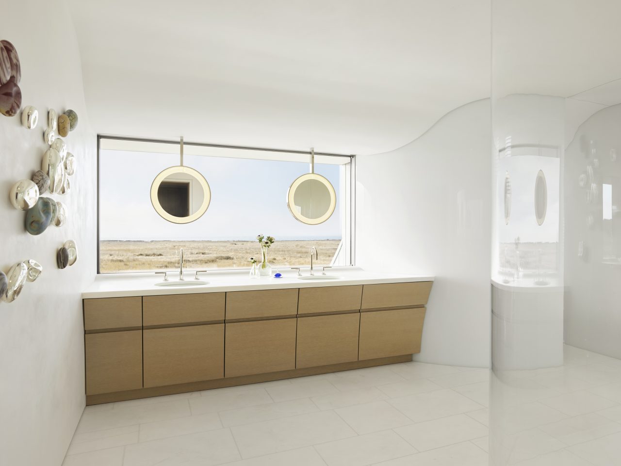 In the living room, the clean white material palette is transformed through the dynamic art of Leo Villareal’s LED installation, shifting the hues in revolving shades of sunrise yellows to twilight blues. The end result is a deeply personal home that strikes a balance between traditional and modern while celebrating the raw beauty of the California Coastline.