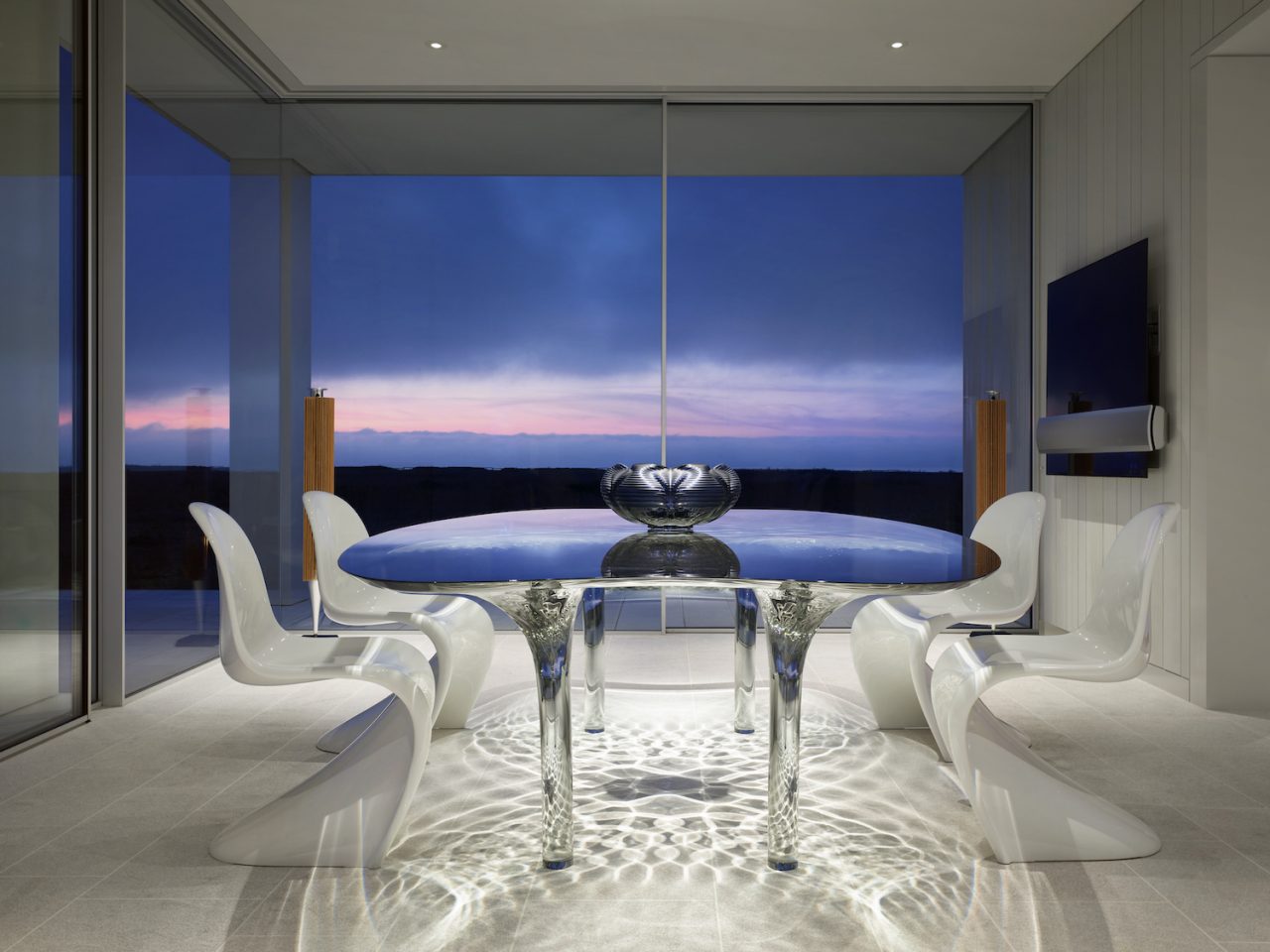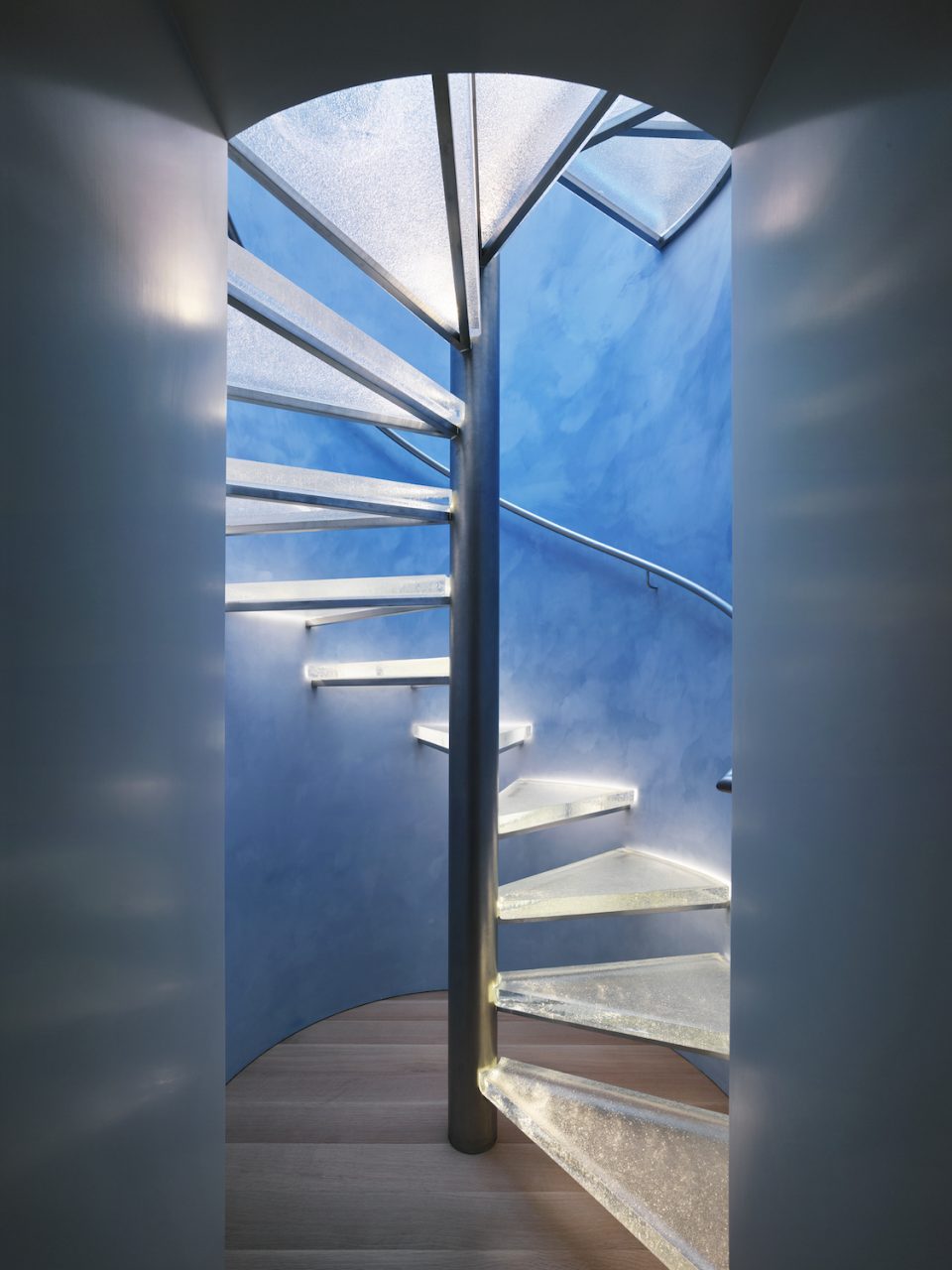 Architectural details are kept spare to allow special design moments to shine. The spiral staircase leading to the rooftop terrace is made of custom glass treads. At night, the drama is multiplied as built-in fiber optic lights turn on and transform each step to look like an illuminated block of ice.