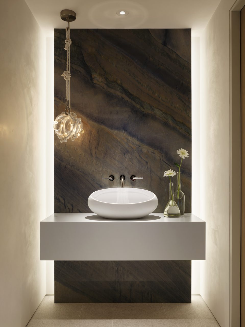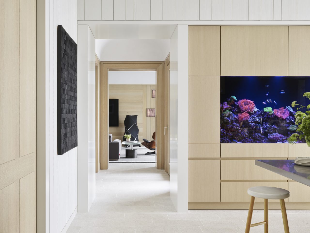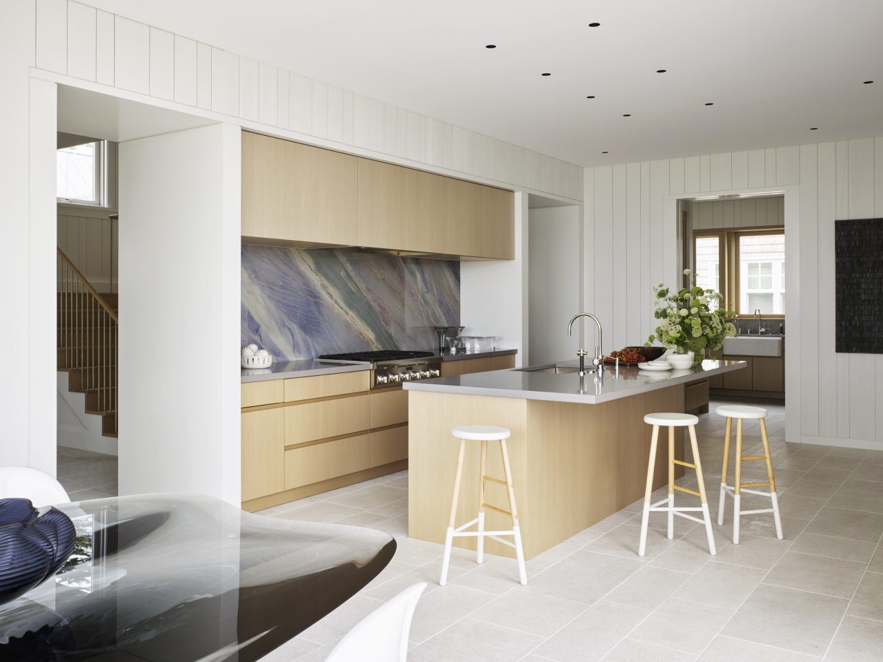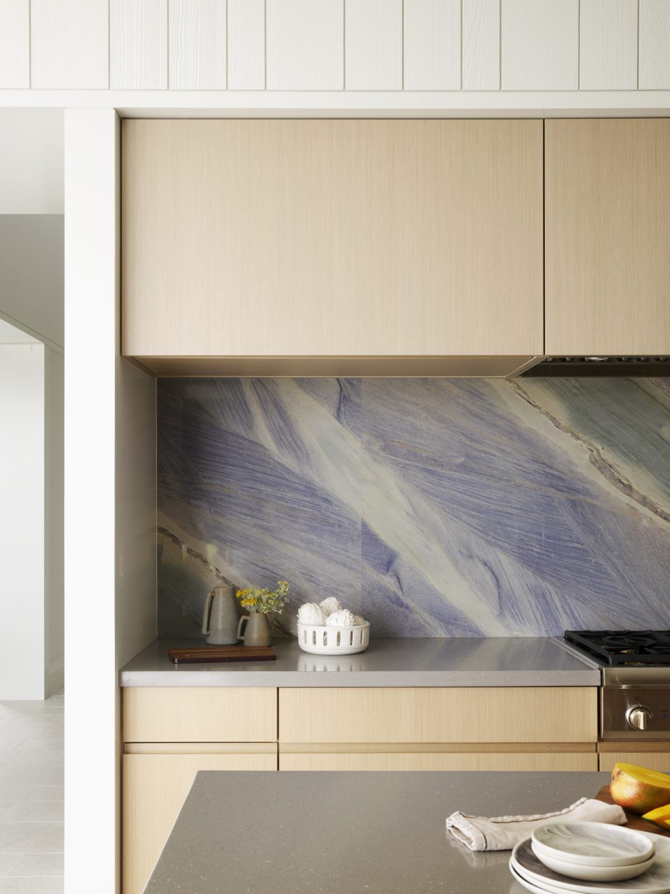 The home’s use of stone fuses this connection to the coast, starting with the white granite used throughout the ground floor, which is flamed and brushed to look like beach sand frozen in time. For the kitchen, the designer found a dreamy Brazilian Azul Bahia granite for the statement backsplash that adds visual currents of colour to the seamless cabinetry. The stone has a really beautiful watercolor effect, which creates this relationship to the water.