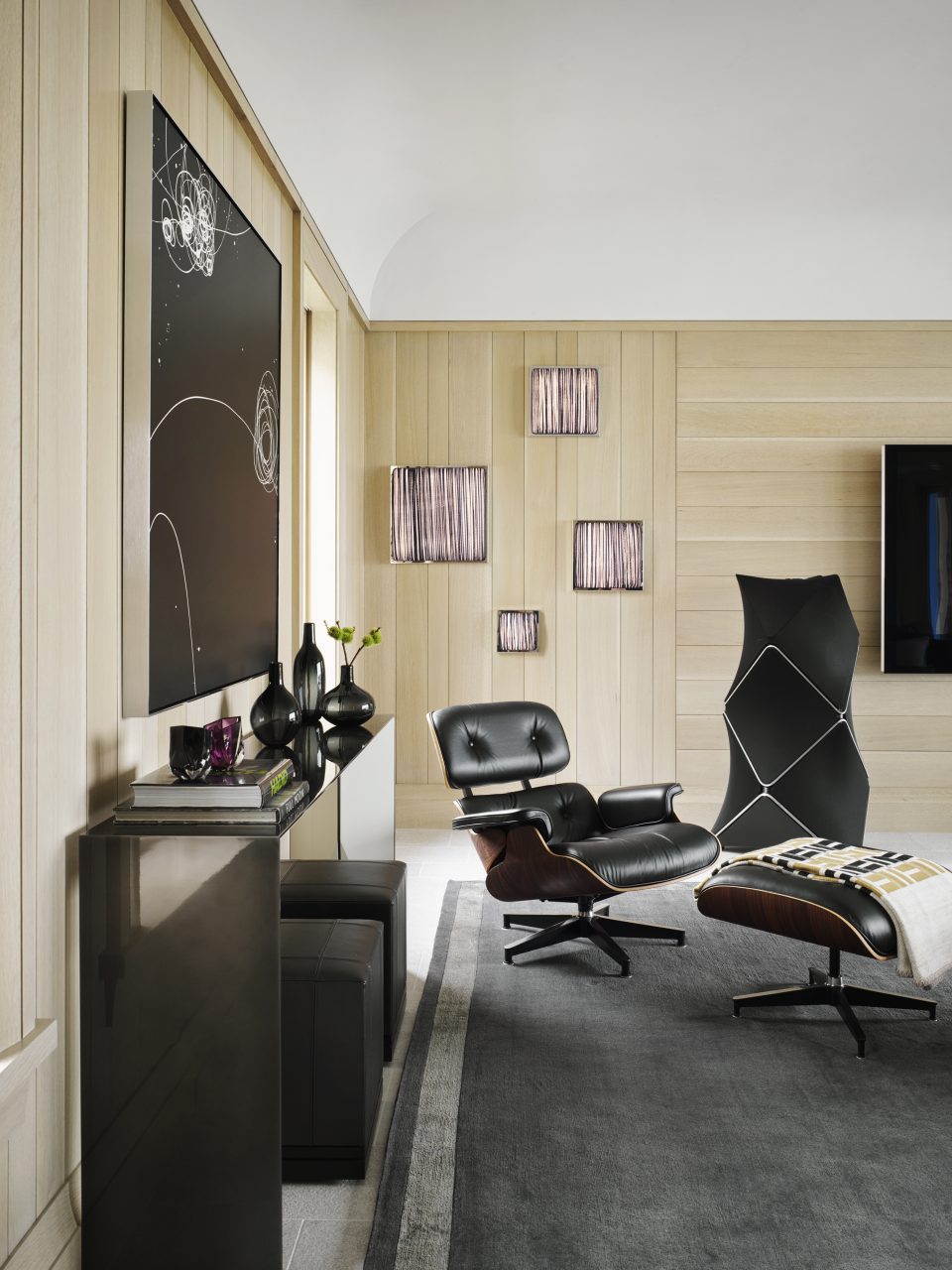 Form and function meet in the family media room, with artfully designed fixtures like a quartet of striped, square sconces by Aqua Creations and custom geometric Bang & Olufsen floor speakers that feel more akin to modernist sculpture than audio equipment. A Rosemary Hallgarten Tibetan rug and classic Eames chair and ottoman complete the perfect listening corner. Above a Holly Hunt lacquered console hangs a painting by Bernd Haussmann.