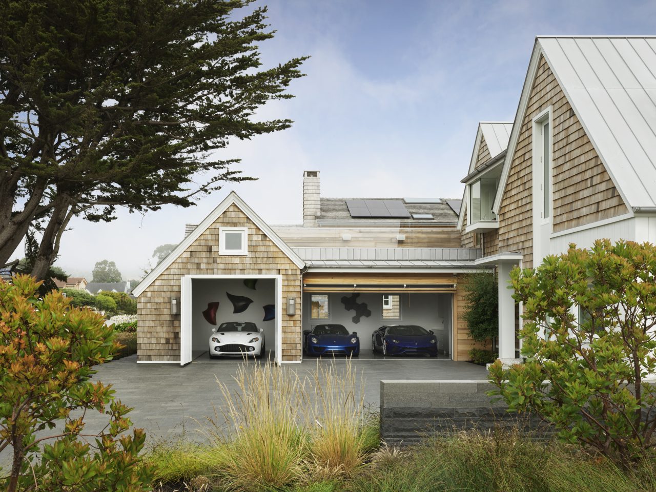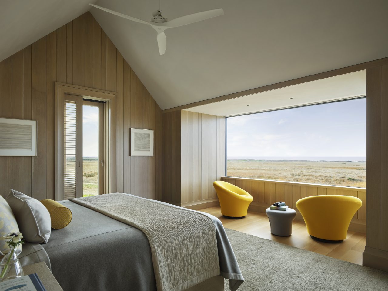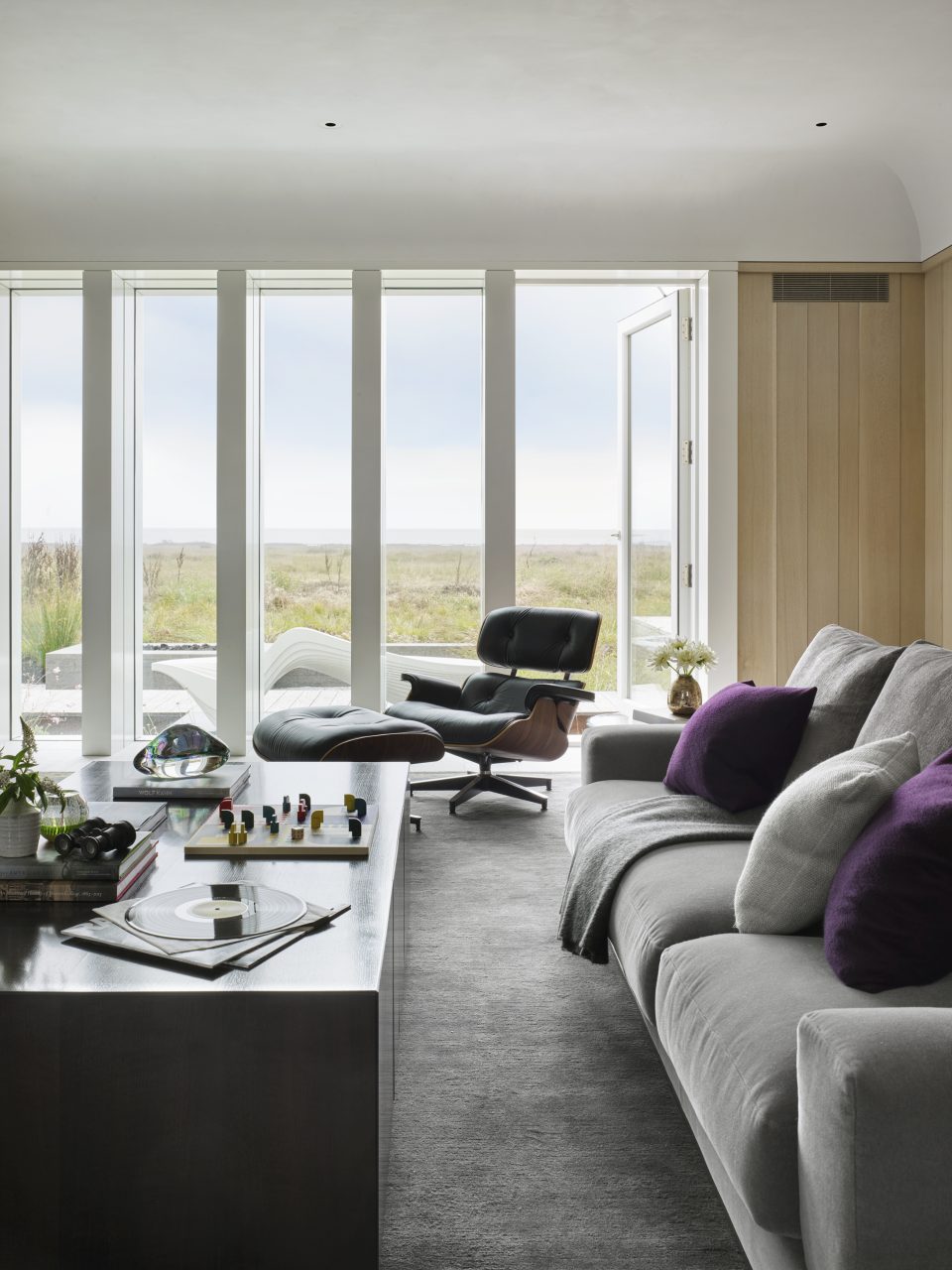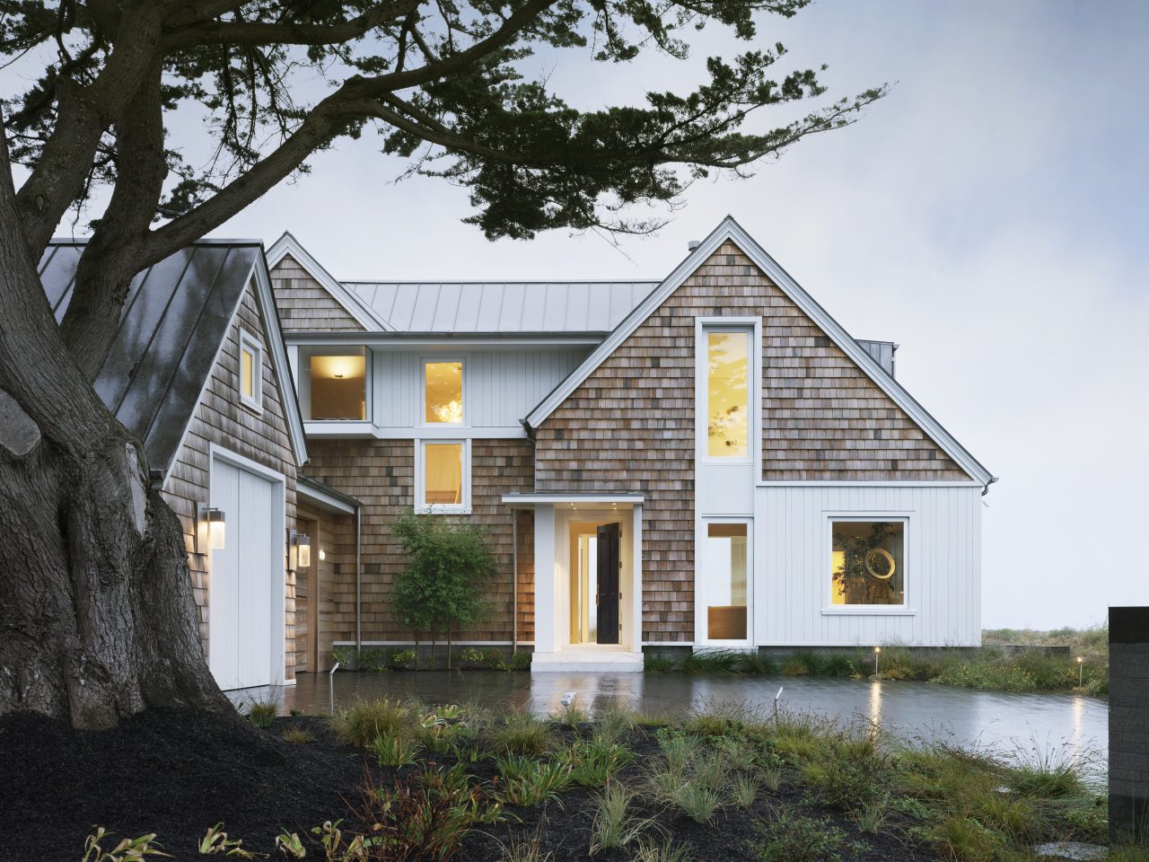 Say the architects: ‘We approached the design by reinterpreting classic Cape Cod architecture, including asymmetrical pitched roofs, shingle siding, and shed dormers, while expressing more modern interiors, essentially threading the needle between old and new. The interior lets the outdoors in with large expanses of frameless windows and sliding glass doors.’