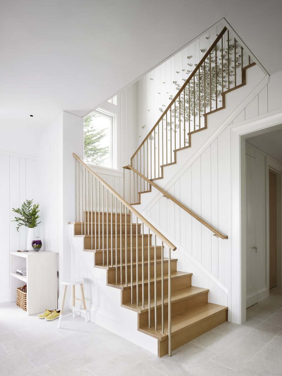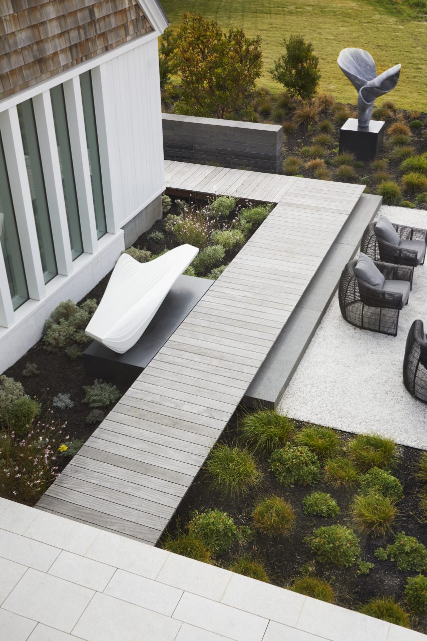 Celebrating the site’s natural gifts also became central to fusing two styles. Modern picture windows disrupt the home’s traditional squareness with expansive panes of glass that let the outdoors in. Unexpected materials introduce an earthiness to the home. For example, for the iconic Cape Cod-style shingle siding, the design team used reclaimed sinker cypress—a Southern wood that spent a century at the bottom of a river, where the elements created what the architect describes as an unique mottled texture. ‘When you get up close, it has a richness and depth that’s unlike anything else,’ architect Walker observes.