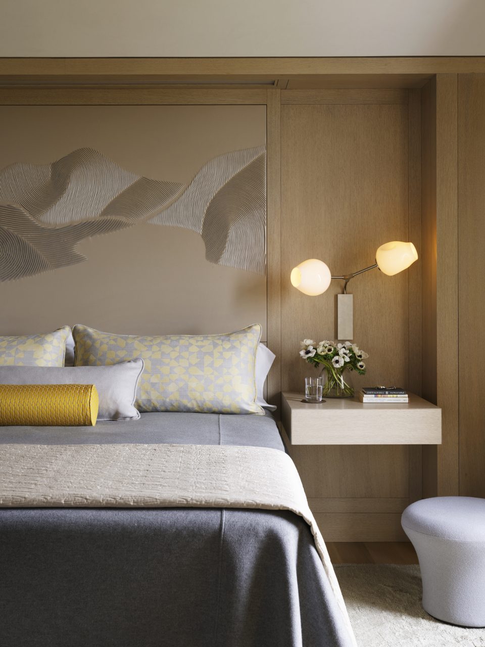 Interior designer, Kristi Will, searched for furniture with sculptural lines, like Vladimir Kagan curved sofas in the living room and bright yellow Pierre Paulin mushroom chairs tucked away in the master bedroom. We notice a nod to modern design, and a softening with plush velvets and silks that bring cozy tactility.