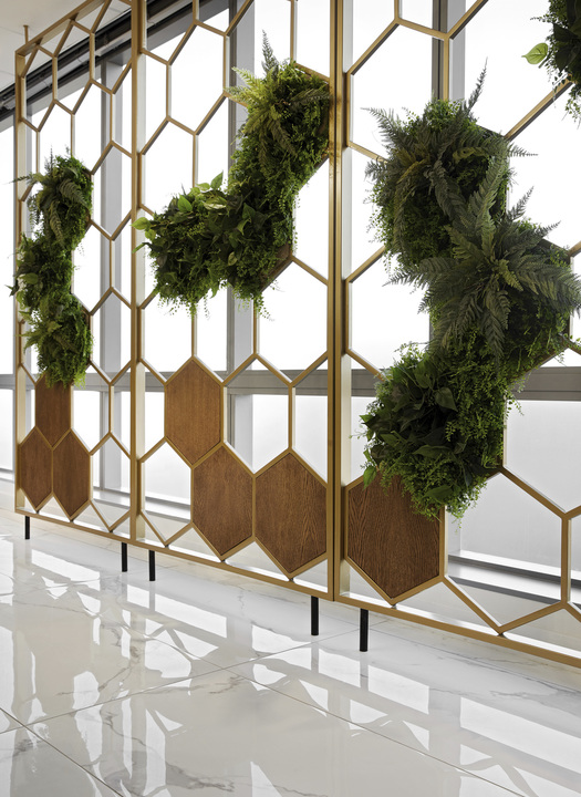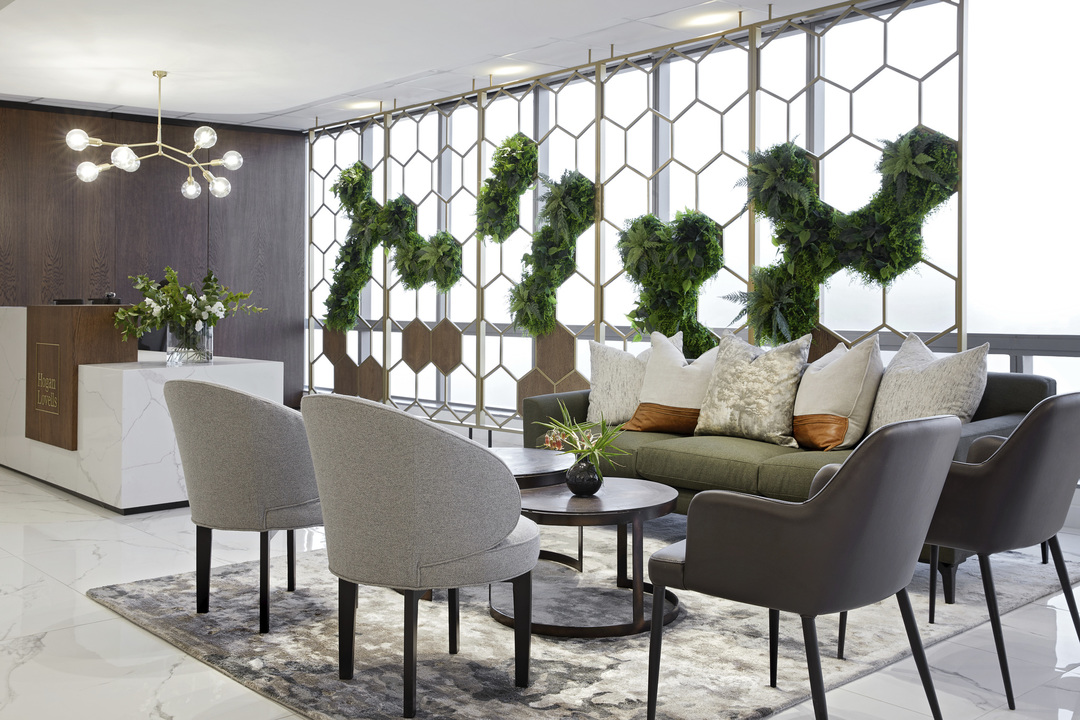 Visitors to the new Hogan Lovells space are immediately greeted by a feature plant wall of steel honeycomb pockets.