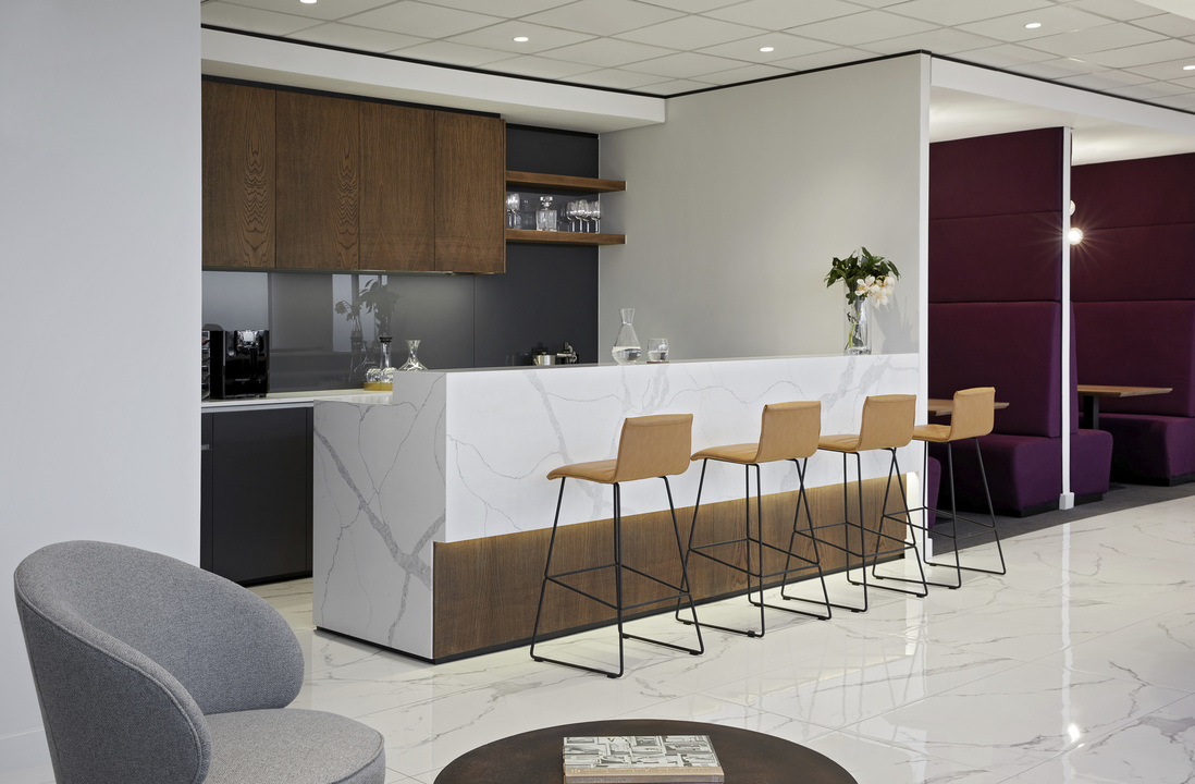 The scope of the project that Tétris delivered was for the 560-square metre client entertainment / interface area and it took four months to complete. The site was an existing office space with perimeter offices and an open-plan area in the centre, with lower levels of natural light.