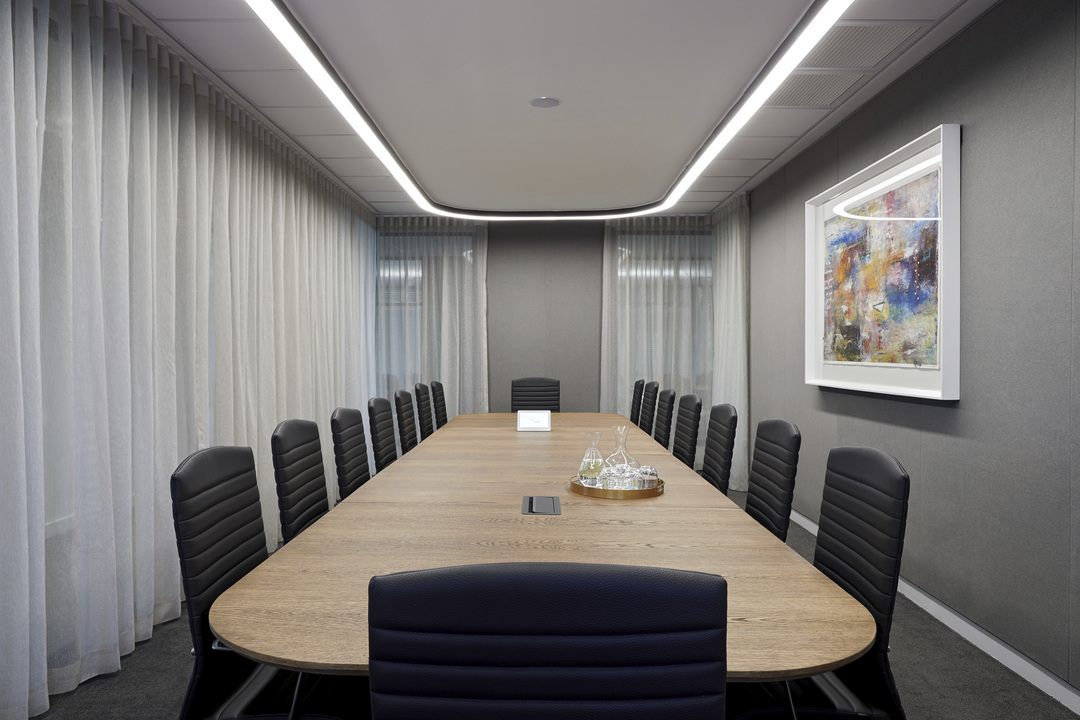 The meeting rooms extend around the perimeter of the floor, varying in capacity from eight to 16 people. The 24-seater main boardroom is strategically located at the centre of the conference suite, equipped with top quality AV / video facilities and specialised lighting solutions. Almost fully glassed in, the main boardroom is a highlight, with curtains rather than vinyl treatments to the glazing that softens the aesthetic of a typical boardroom, while echoing the luxury hotel vernacular.