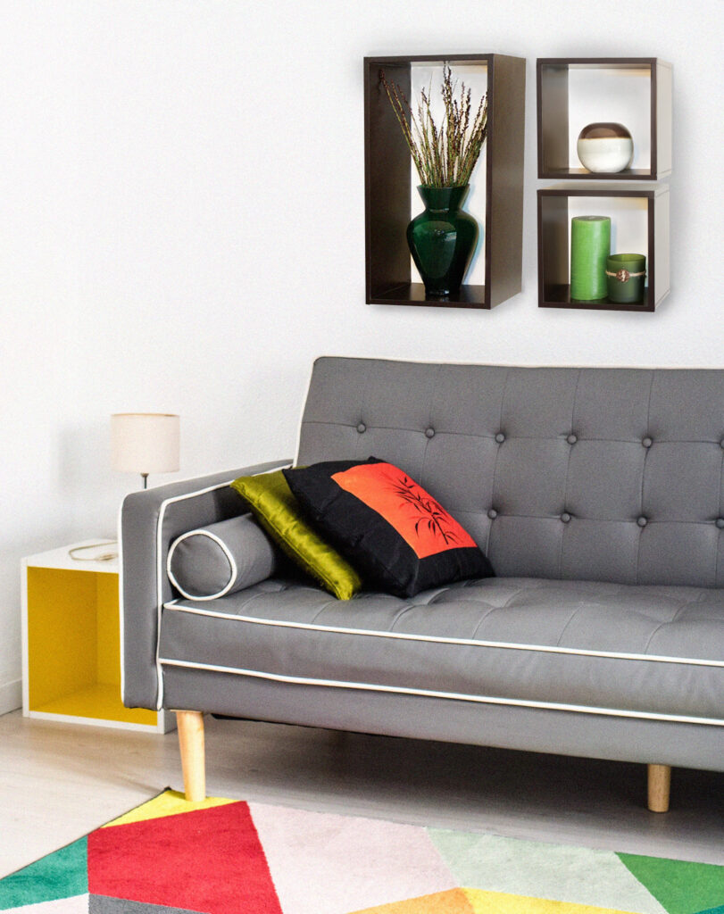 In the living room, leave plenty of space for furniture by displaying picture frames and marble sculptures on floating wall shelves. To dress up a blank wall in the entryway, add wall-mounted bookshelves with a set of flameless candles and ceramic planters to brighten the hallway. If your place doesn’t have the space for a console table, just hang a floating shelf to keep your keys within reach as you head out the door. Looking for inspo on how to style them? Give your home office a classic touch by hanging wooden shelves above the desk and chair. For unique storage in your kid’s bedroom, showcase trophies and toys in cube wall shelves, then organise books and games in a complementary floating bookcase. Create seamless storage for bath essentials by colour-coordinating shelves to the walls of your bathroom.
