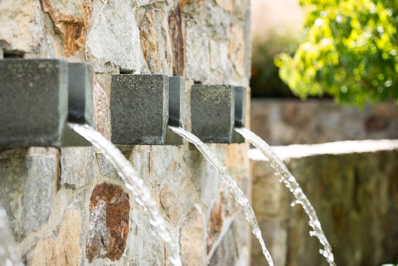 Eight water features act as focal points, helping to organise space and highlight a collection of figurative art that is placed throughout the landscape. A symmetrically organised sunken garden with sentinels of upright beech trees under-planted with roses is visible from the auto court, house and living terraces. The swimming pool and formal fountain garden are set in a picturesque landscape planted with meadows, woodland gardens, and lawns. Each garden room offers expansive vistas through the garden and to the distant hills.