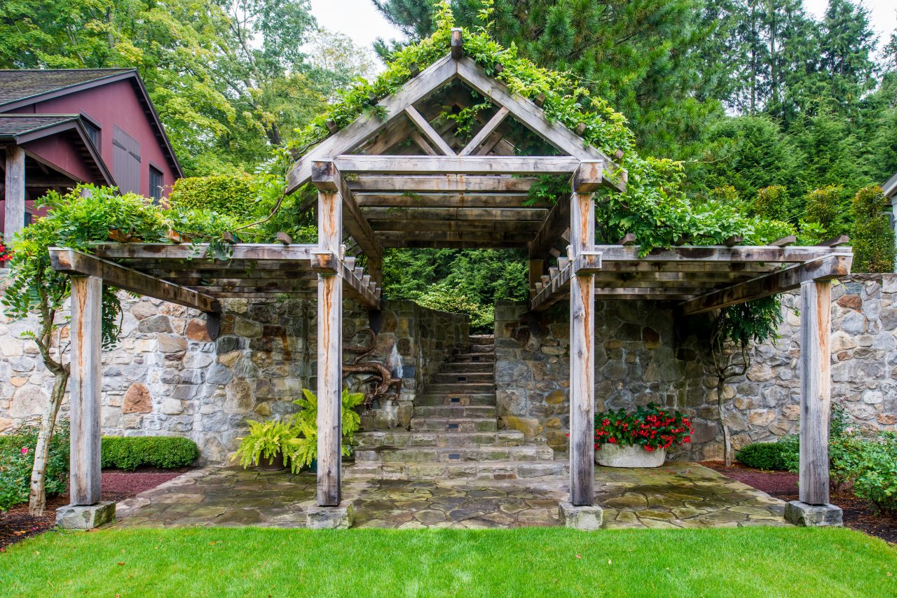 Wooden gateway arbor with stone walls and steps.