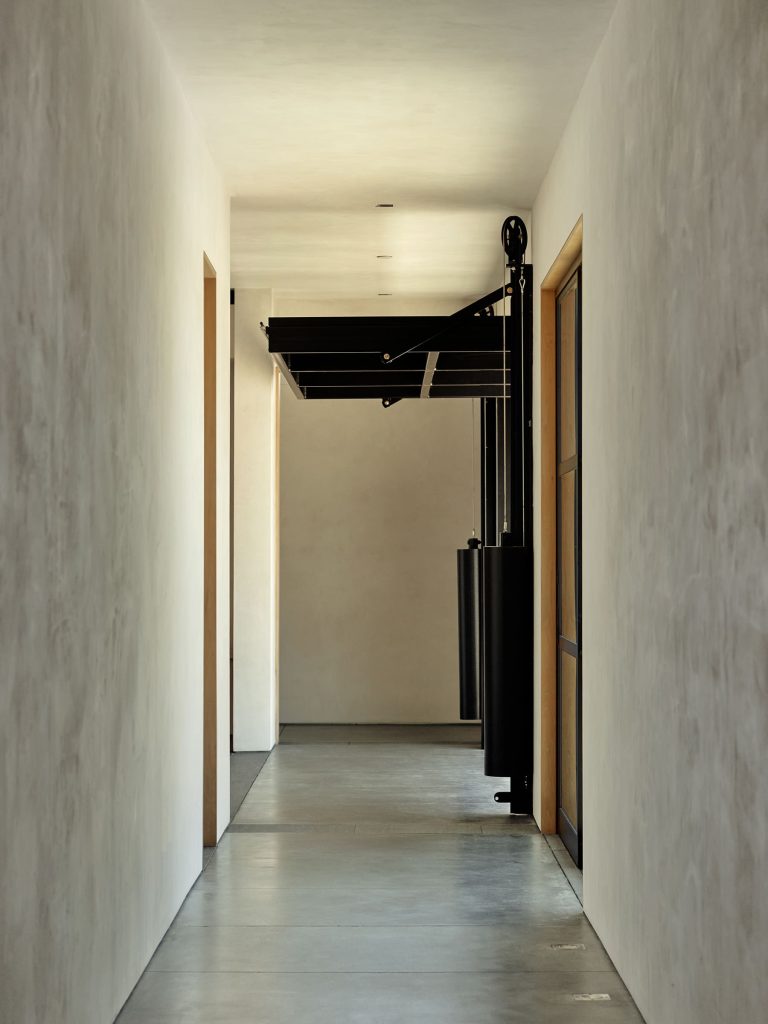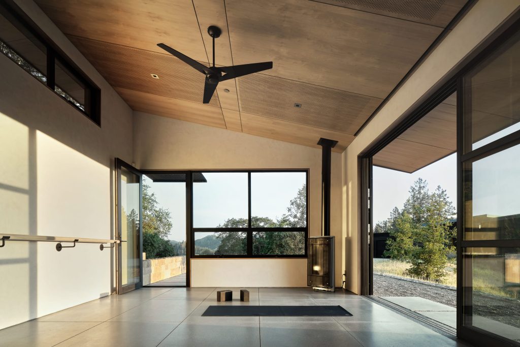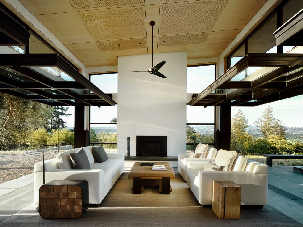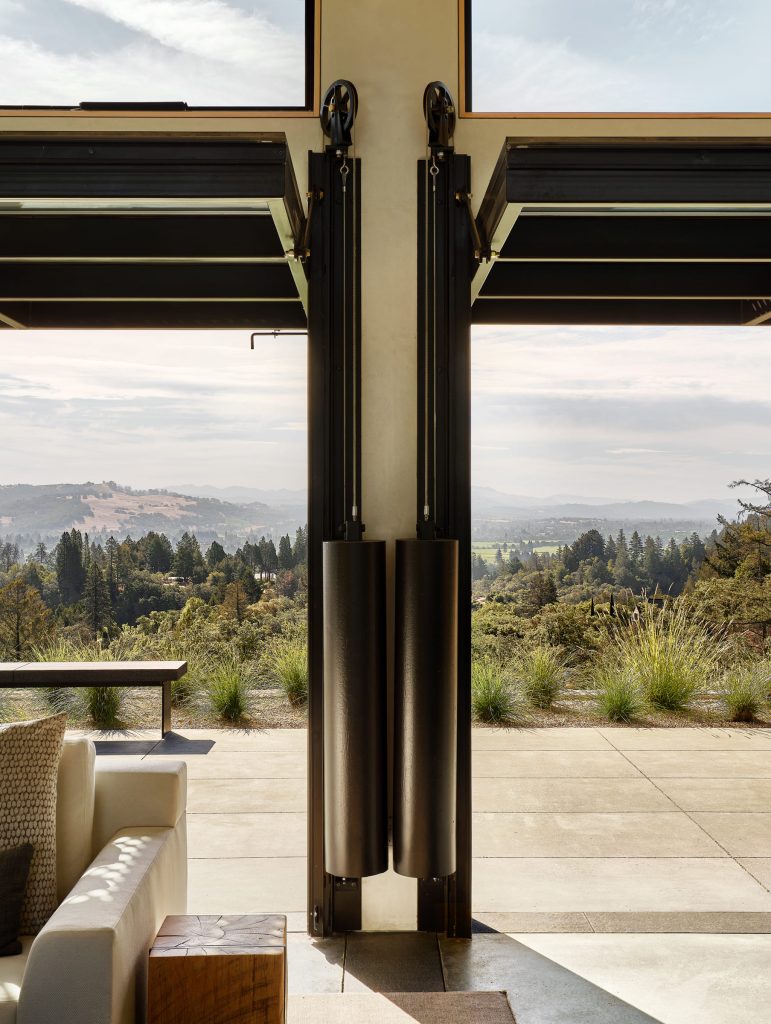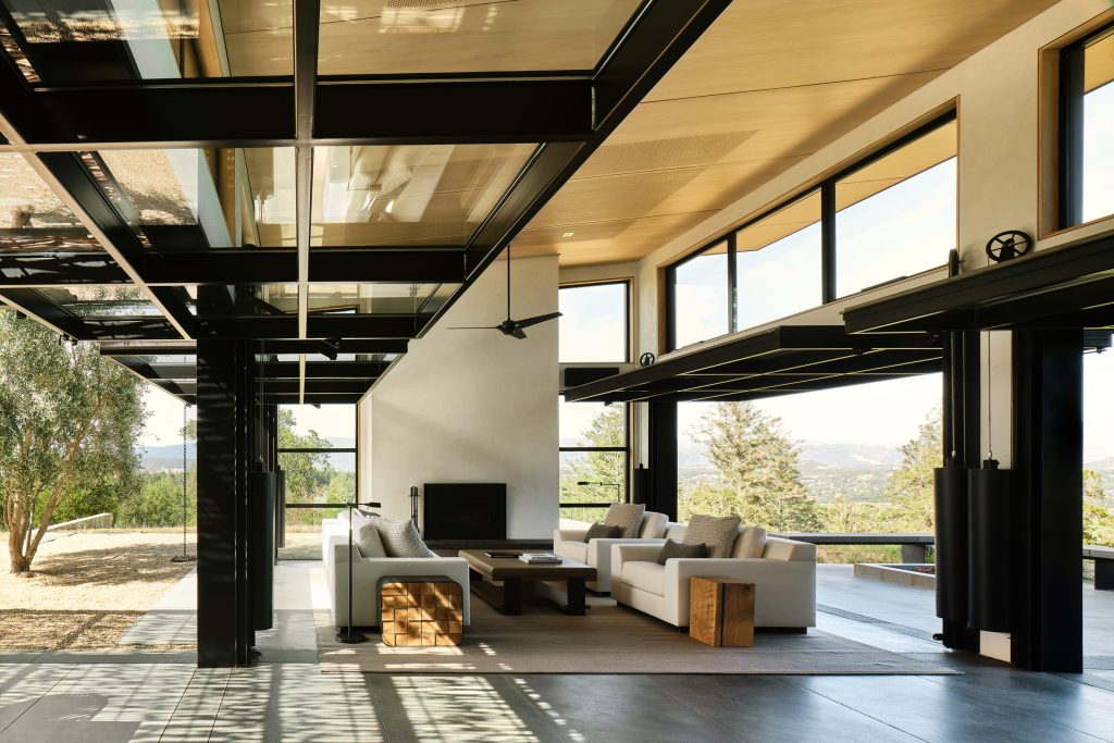 The four oversized counterweight glass doors open dramatically on each side, transforming the space into an outdoor pavilion whose flush concrete floors extend into a poolside patio to the west and a terrace and fire pit to the east, offering comfortable outdoor living in both hot and cool weather.