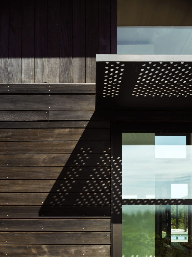 The home’s public wing runs along the ridge of the hill and houses at the heart of it: the Great Room, under a simple shed overhanging roof, immersed in multidirectional views and both morning and afternoon light. With soaring ceilings granted by a slanting roof and the defining feature of generous glass walls, it is a refined, light-filled space which is ideal for entertaining. This innovative operable window system allows this contemporary build to welcome the striking landscape inside. Perforated panels line its lofty ceilings which discreetly absorb sound during larger social events.