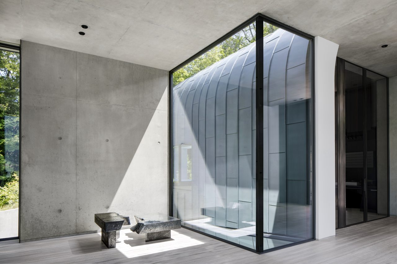 By at the the same time blending in and standing out this project testifies to a rare dexterity and achieves a statement-making tribute to both its spectacular lakeside setting and to the many hands that made it. Just as its alpine setting has been formed by many forces over time, Villa Courbe is an intuitively shaped residence, iteratively by many hands – from sun and topography to brief and local zoning regulations. Seen from the water, the house appears almost at one with the wooded hills that rise gently out of the lake and yet very different to the traditional suburbia that surrounds it. The concept responds to the earlier topography and drives the design to contrast with the neighbouring houses that appeared only after the glaciers and ice had done their work.