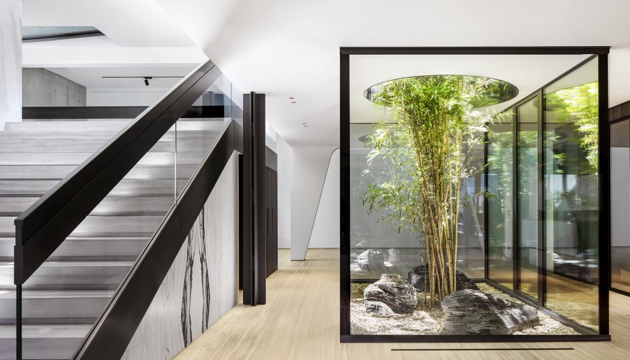 The first of these – at the entrance – is largely closed up with zinc cladding to provide privacy, but high-level clerestory windows scoop art-friendly light deep into the basement gallery. The fissure between the slices creates a generous and private south-facing courtyard in the centre of the plan and this, in turn, has a lightwell cored out into the basement below. The roof is punctured with strategically placed skylights whilst the impact of the summer sun is moderated by a laser-cut aluminium shading screen that follows the curves of the roof and plan and provides a datum for glazing and window treatment. The pool is also used as a sort of lightbox with a glass wall bouncing light into the basement. The result is a series of luminous spaces characterised by varying types of light – from soft art-friendly illumination that filters down the basement gallery to the generous daylighting that suffuses the principle living spaces.