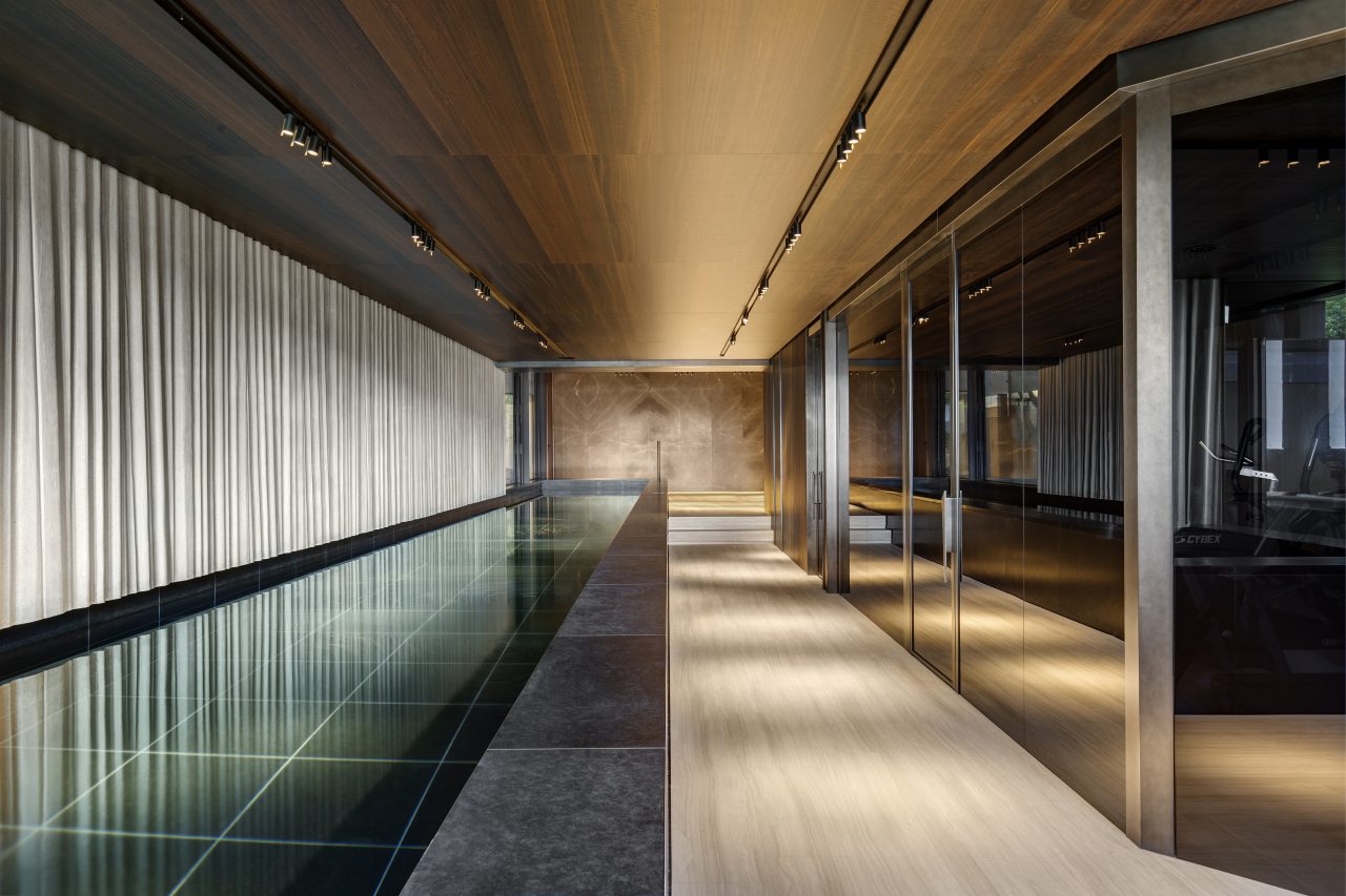 Materials were chosen to respond to these bright spaces. Zinc-clad on the outside, the entrance appears robust and opaque; whilst within the deep light scoop, the basement areas are lined with white walls and ceilings. In the main living spaces, rich timber ceilings and natural stone walls combine to add warmth and texture. Black marble shot through with white veins, and limestone layered in horizontal bands, echo snow-clad peaks and sedimentary rocks, whilst front door and gates open up in Bond-like copper-clad clockwork. Concrete is also used in a variety of ways – from heavy board-formed panels in the entrance hall, to the monolithic curve of the pool cabana, to the curtain-like walls of the basement pool and spa which were cast using a proprietary elastic mould system. Triple glazing (some of it curved), solar water heating, geothermal heat pumps and an insulated, planted roof combine unobtrusively to raise the performance of the house to a level suited to its environment.