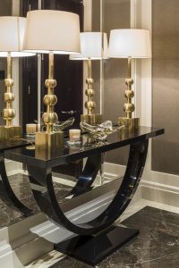 39 – Console table in entry lobby with brass-based Hardwick lamps