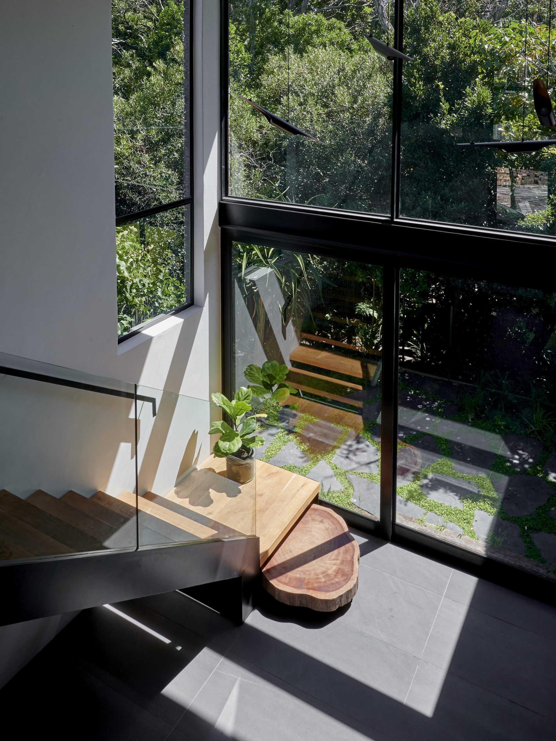 DW: We lived on the site in an old cottage prior to the build. While debating the build, we used whatever available money we had to develop the landscaping. The site bush was contoured, and a section was cleared for lawn while the forested area was densified with indigenous tree planting.
