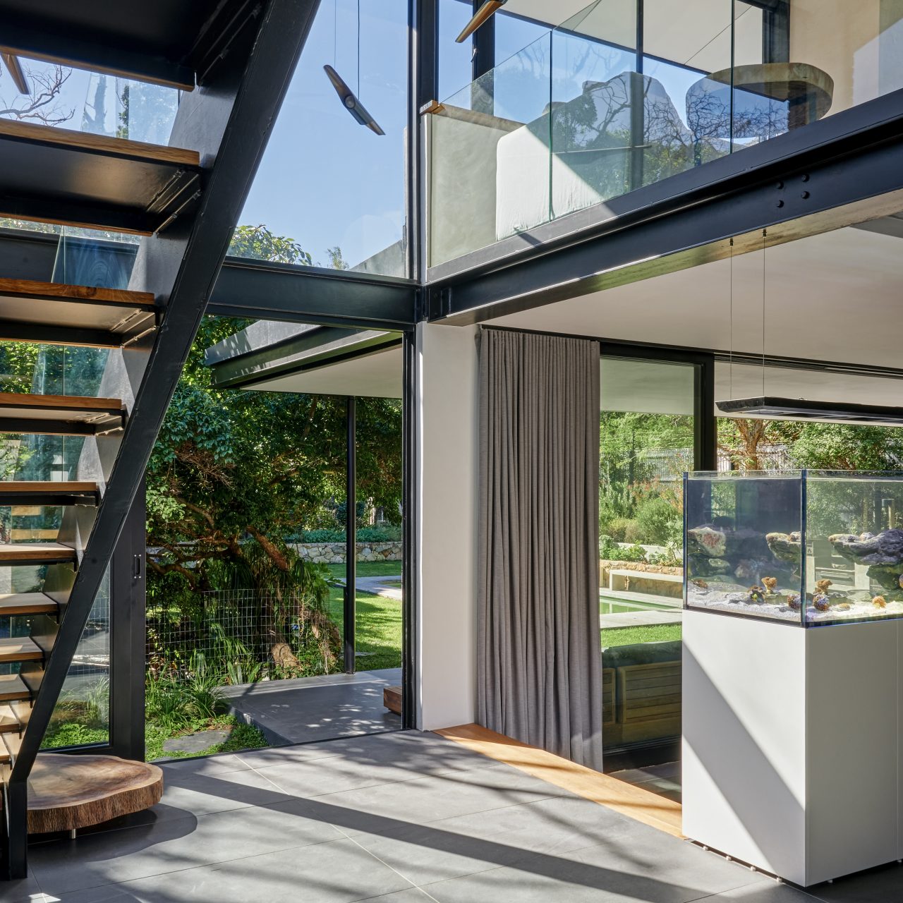 This appealing rebuild for a family of four involved the integration of a forest site, koi garden, tree house and path in the forest ravine estate Bamboo Lane of Hout Bay’s Scott Estate. The house was built using the existing structure of an old cottage and the design maintained historic guidelines of face-brick and slate, albeit in a new contemporary style. Arguably the most difficult project for any architect is building his own home, and this one was no exception. To complicate the already demanding process further, it was built during the pandemic lockdown: starting in February 2020, and completed by October of the same erratic year. The result puts into perspective a hundred hints from sages in history – roughly that the greater the obstacle overcome the greater the glory, and the richer the quality of success.