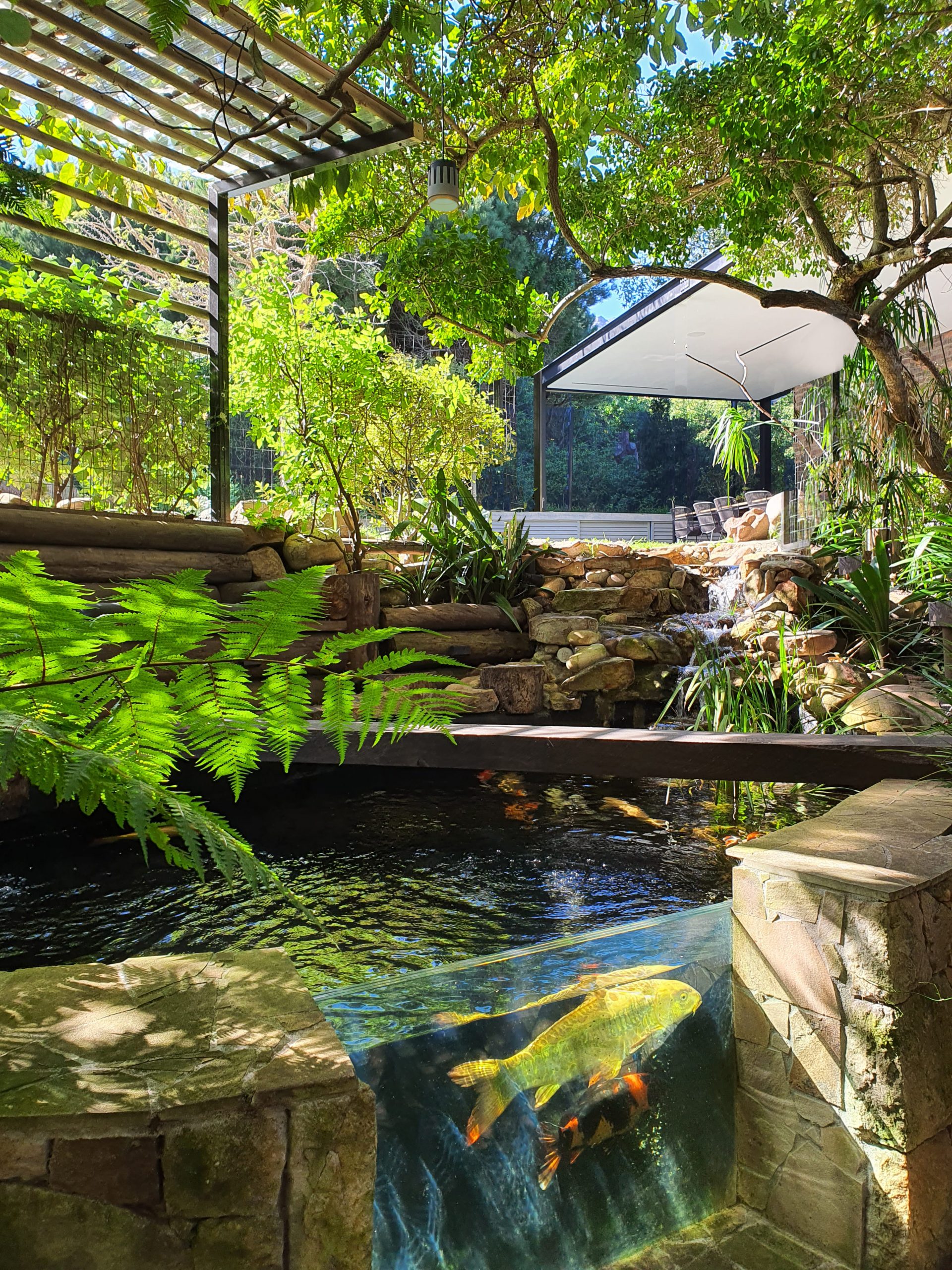 We wanted to capture the depth of the forested site. A journey was designed to stitch through the property from the double volume glazed entrance, past the coral reef and down into the garden koi pond / boma, which was built into a natural spring on the property.