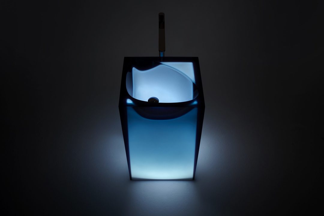 A rigorous and essential volume, softened by the translucency of Cristalmood, an absolute parallelepiped, devoid of any ornament, whose perfect geometrical shape is ‘carved out’ by the force of the water which, drop by drop, generates the lowering of the Aura basin.