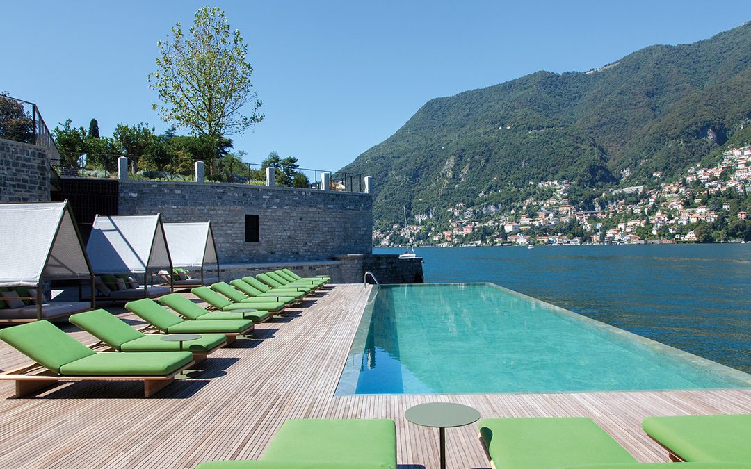 The cushion fabrics are from the Terrain outdoor fabrics collection by Doshi Levien, and the decorative cushions from the Geometrics range.