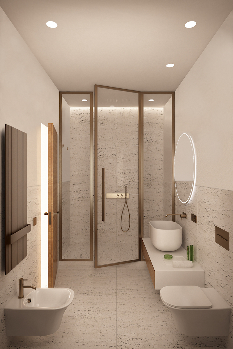 The designers selected a range of materials that helps enhance the natural elegance of each space: wood and travertine marble play a key role and have been used for finishes and surfaces in the living room, bathroom and bedrooms.