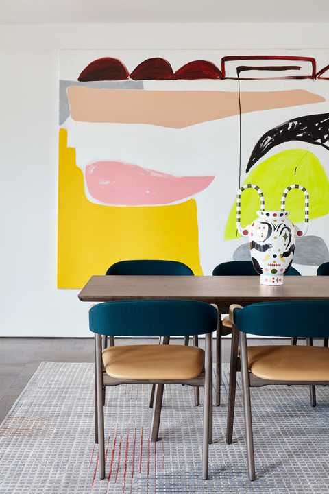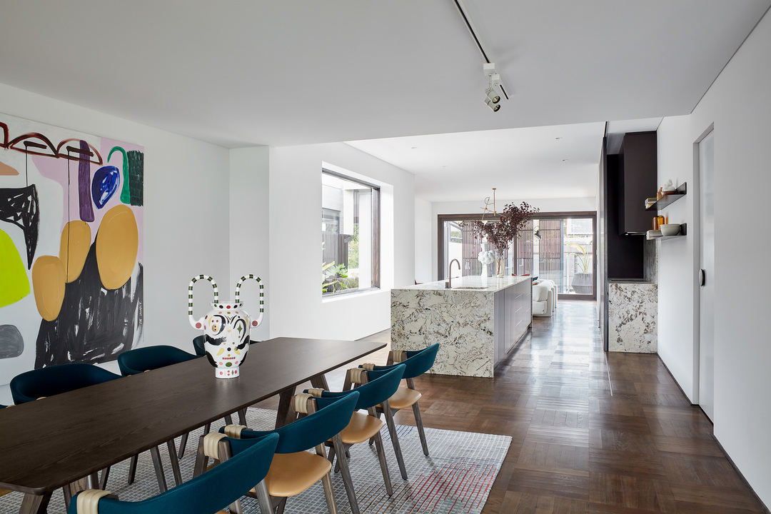 An abundance of sun is available in the front balcony – super architectural in its nature and providing an inner viewing to the timber battened operable shutters – where the grace of a welcoming, relaxed vibe of Urquiola’s Vimini collection by Kettal highlights a modern twist of traditional, elegant and warm materials.The warmth and colour from the outdoor area gently flows into the adjacent dining room, which is defined by Golran’s impeccable Meteo Rug by Inga Sempé that houses the dark-stained version of the Moroso Mathilda table and chairs, a stunning and vibrant entertaining area for the home owners.