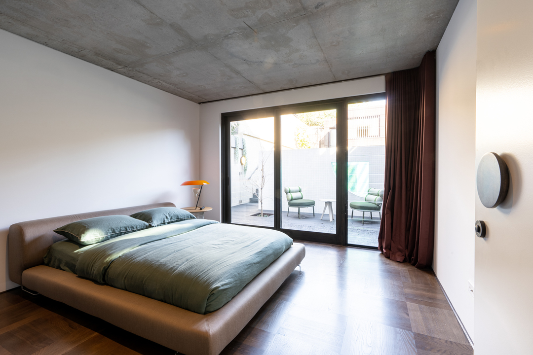 The multidirectional use of the sofa allows the user to face outward toward the light filled courtyard or reflect back at the artwork on the opposing wall when using the intermediate space as a place of reflection and pause, which also doubles as a void to ensure privacy for the master bedroom.