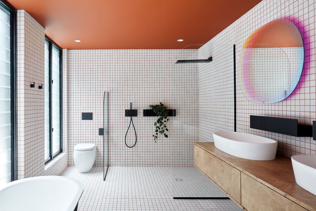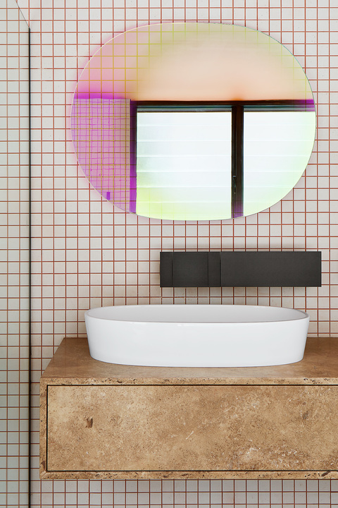 The three bathrooms on this level are tied together by the clever use of graphic tiling, vibrant colour and the fascinating and magical Shimmer mirrors designed by Urquiola for Glas Italia, which throw dancing shadows of colour on the tiling behind.