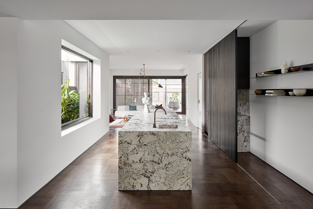 ‘Layering the second skin of timber battens to the openings of the building façade allows the residents to control and modify their experience of the home both internally and externally. The mechanical opening movement of the shutters imbues the home with an almost animated quality and a sense of movement that is engaging. It is functional as a shading device and privacy screen, but also adds a layering effect to the façade that emphasises visual depth and the movement of shadow and light from the street.