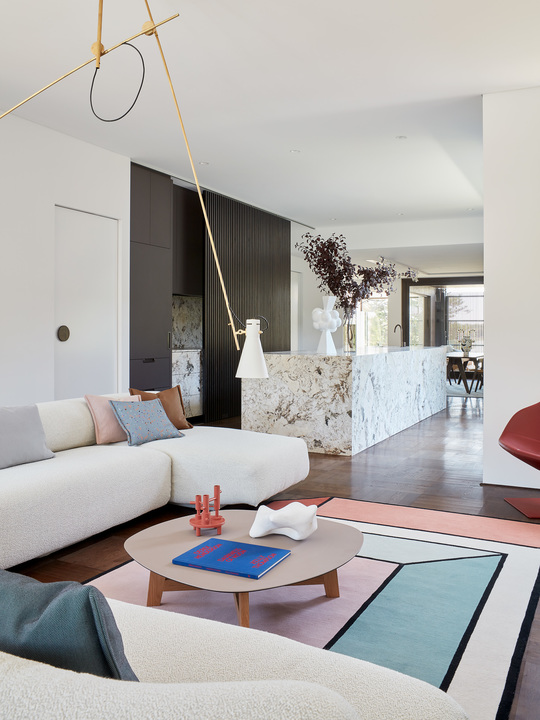 In addition to the skilful detailing of the balustrade, Patricia Urquiola’s gem-like Fordite rug by CC Tapis is a standout in the entrance bringing a joyful sense of scale and colour to the entry.