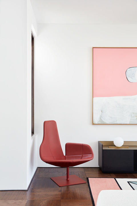 The monochromatic layering created by the nude Slinky Rug by CC Tapis and the vis a vis Moroso Tender sofa, both designed by Patricia Urquiola, show the clever use of furniture and forms to define space in the gallery area; which divides the master bedroom from the other areas on the first floor.
