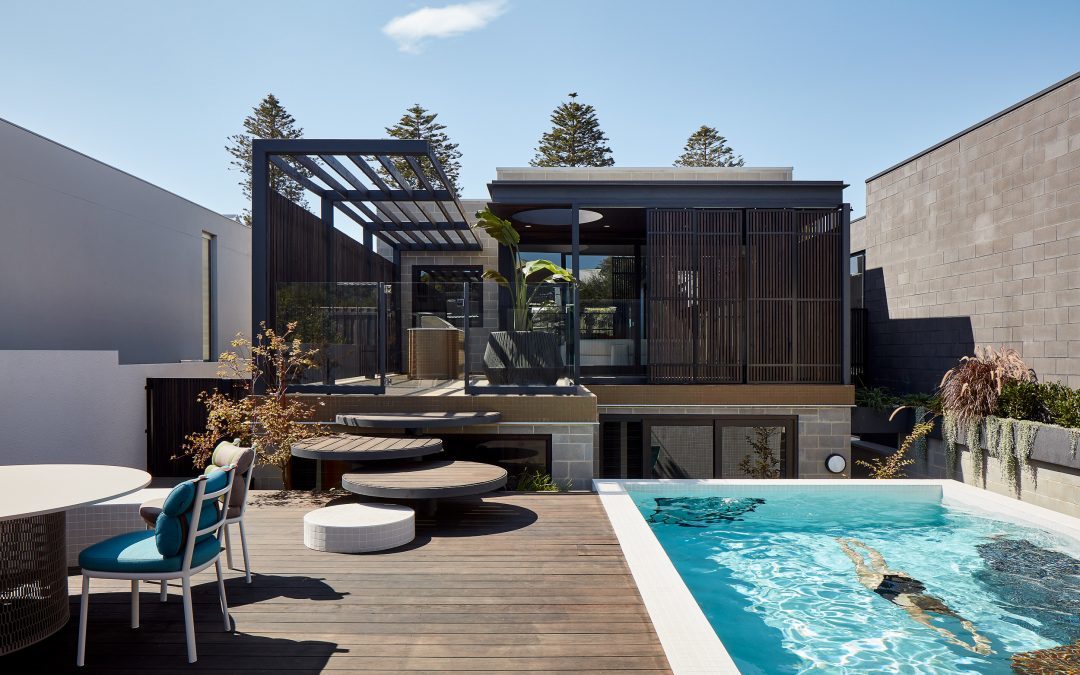 The outdoor terrace and pool area, which are connected to the main living area, are adorned with State Of Kin’s recognisable, curved deco references, richness and balance of colour and materiality, which is best demonstrated with the tiling in the area, clear cut deco inspired reveals into the pool and the custom tiled curved bench seat; that has been coupled with Urquiola’s Mesh Table and colourful Roll Chairs from Kettal.