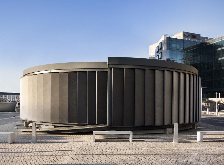 Mirroring a journey through the built environment of the city of Cape Town in both physical and cultural terms, ZOETROPE is constructed using only local materials and talent. It comprises a steel frame structure clad in 72 concrete panels which were made using sand sourced from the 12 filming locations and the same cement used to construct the original Silo building (which lies adjacent the pavilion). The structure merges with its historic surroundings through its very DNA, as well as the geographic imagery experienced once you enter the installation. Roofed with modern solar power technology, the sculpture is completely off the grid, producing 11.4 kW of energy that powers the audiovisual equipment used inside.