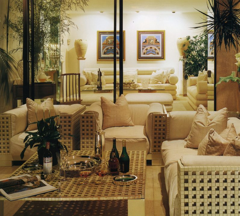 The decorator’s own home in Bryanston, Jhb reflects his Italian heritage. It includes mirror tiled walls, hand painted wall effects and definitive Oriental touches. Interior by Marco Opezzi, 1978.