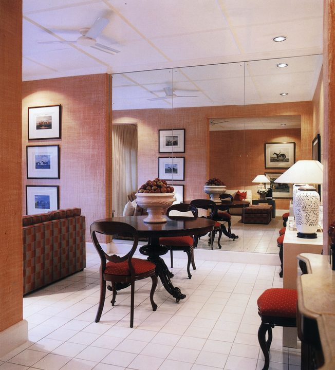 An elegant solution to bachelor lifestyle is reflected in this apartment in a circa 1900 building in Musgrave Road, Durban. Distressed wall finishes are combined with a mirror wall and white tiles to counter Durban’s humidity. Ceiling fans add a colonial touch. Interior design by Mario Rodrigues, 1988.