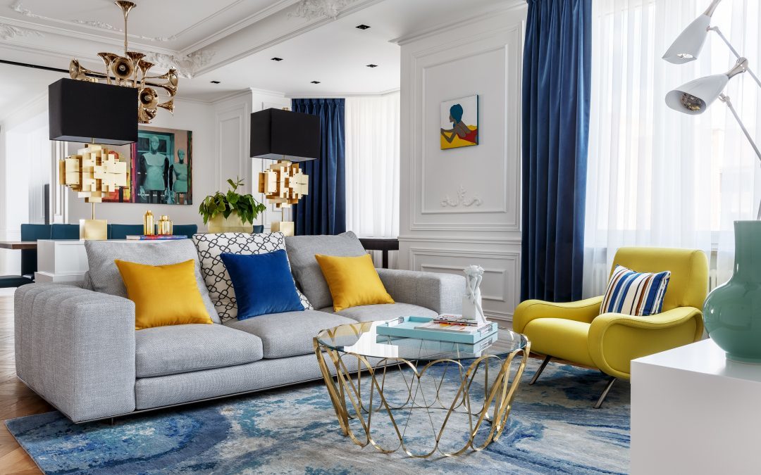 The result encapsulates a striking spectrum, stylish furniture and impressive contemporary artwork. The apartment’s planning comprises three areas: a large living room adjoining a space that combines kitchen and dining room, plus two bedrooms – a master suite and second bedroom for the owners’ daughter.