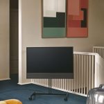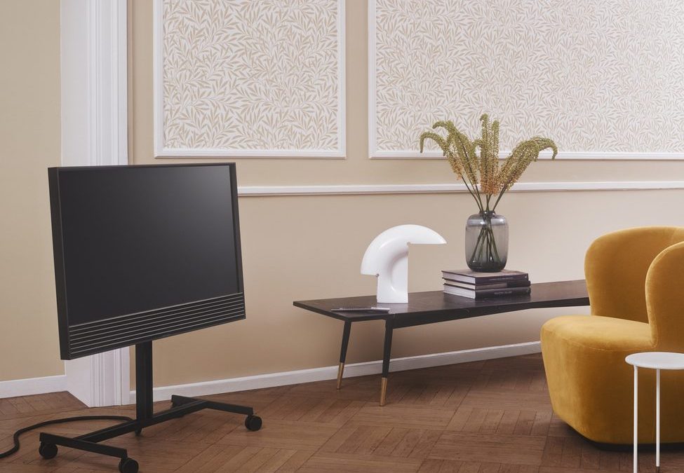 BeoVision Horizon mounts elegantly on the wall, but it can also be placed on a set of wheels, a 360 degree rotating floor stand or casually leaned back on the floor on an easel stand.