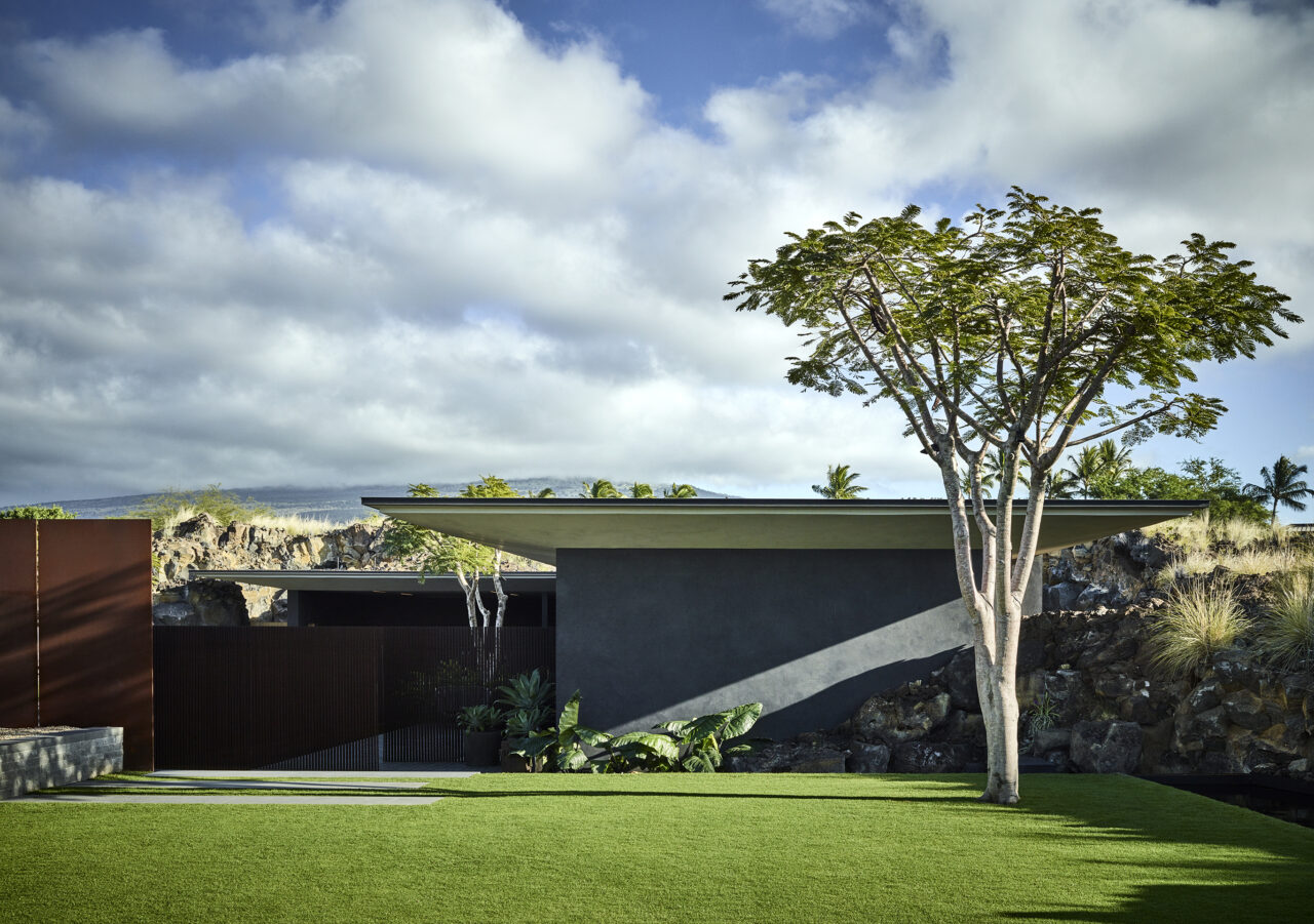 Decorative corten steel panels screen the autocourt from the rest of the property and direct guests toward the courtyard and ocean views beyond. This entry sequence provides a transitional experience from the sunken autocourt surrounded by lava, stepping up on axis to the elevated courtyard and dramatic reveal of the oceanic panorama at the main hale (in the Hawaiian language, hale (pronounced hah-leh) means house or building, augmenting the sensation of vast openness that initially drew the clients to the site.