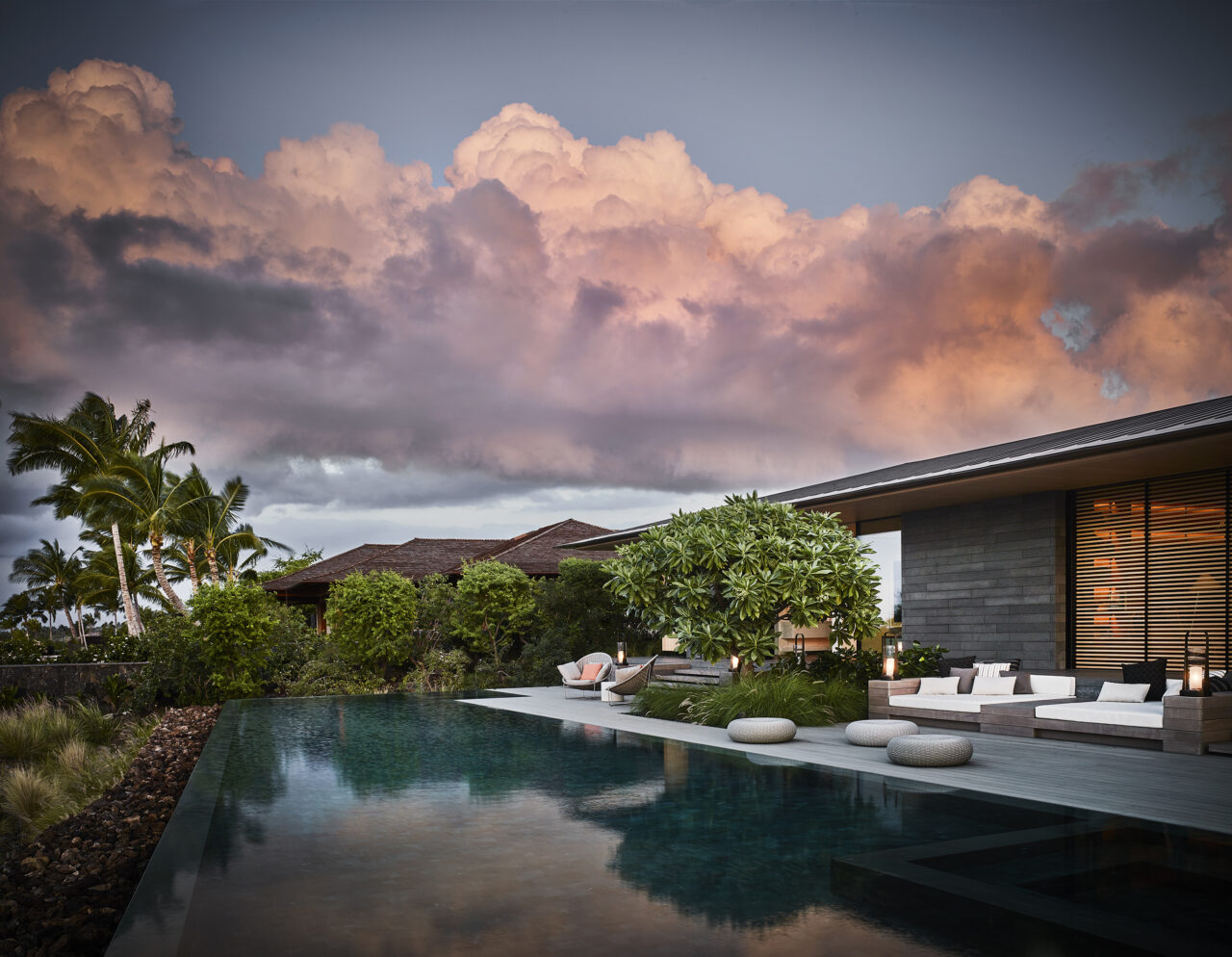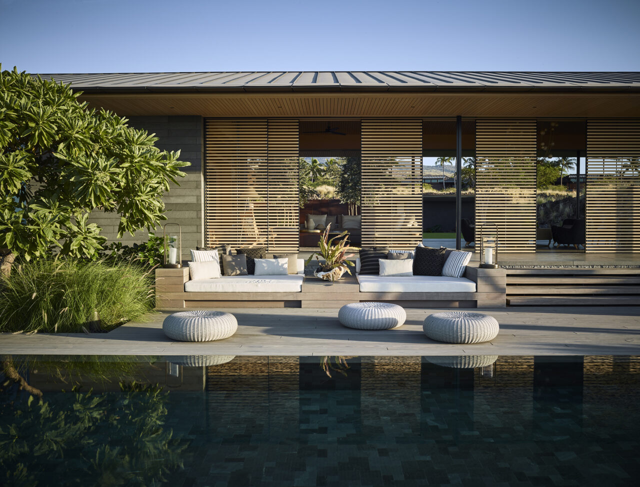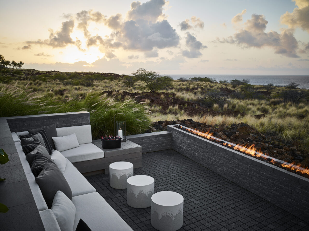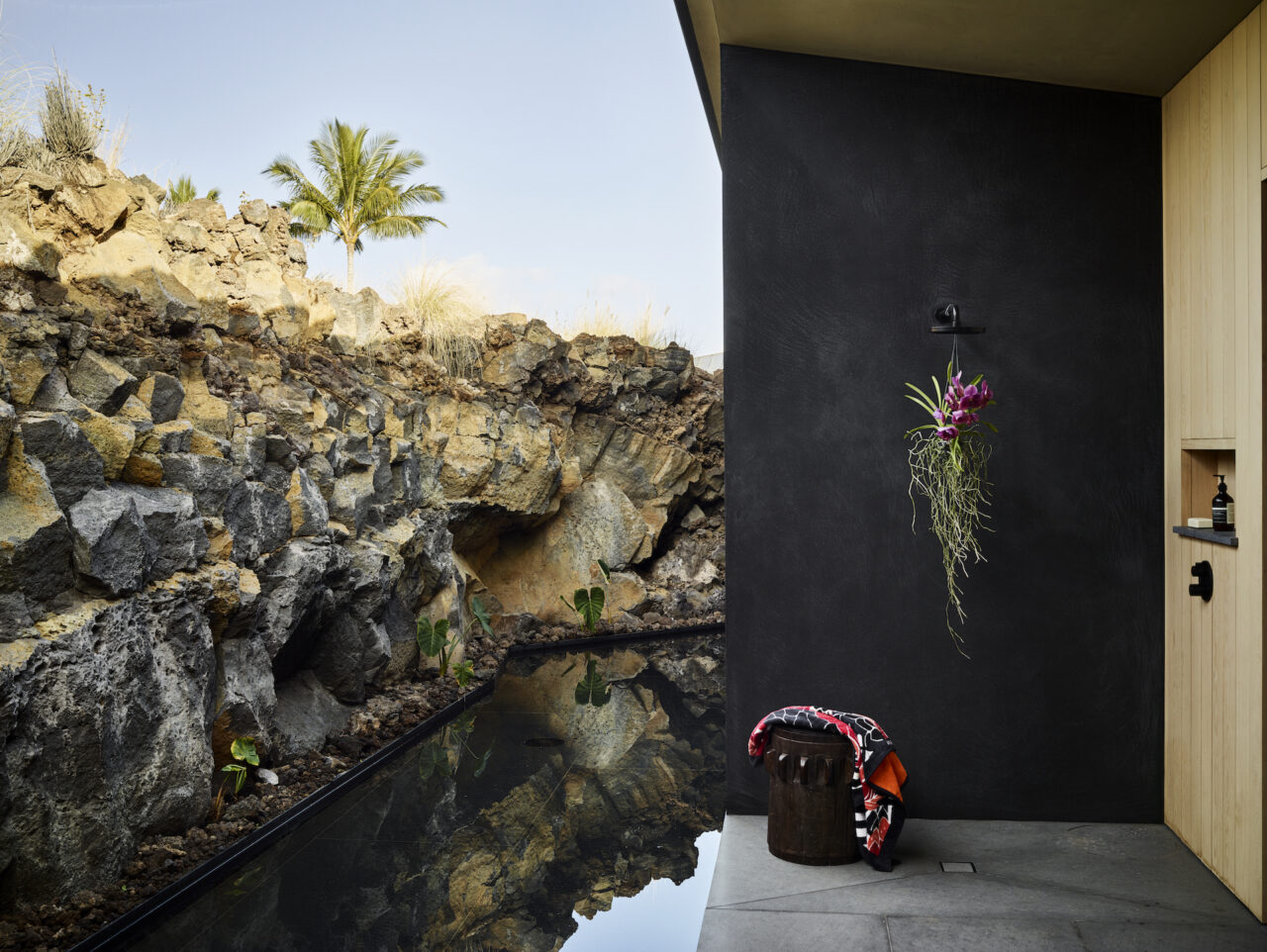 Blending the line between inside and outside, the courtyard is framed by a raised tree bosquet and lava outcrops mirrored by a series of reflecting ponds. The courtyard serves as a private gathering space shielded from trade winds where guests can take in and appreciate the views of the mountains and the sea.
