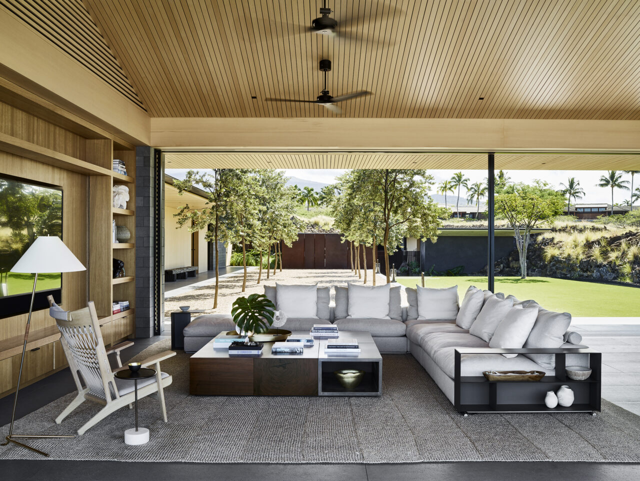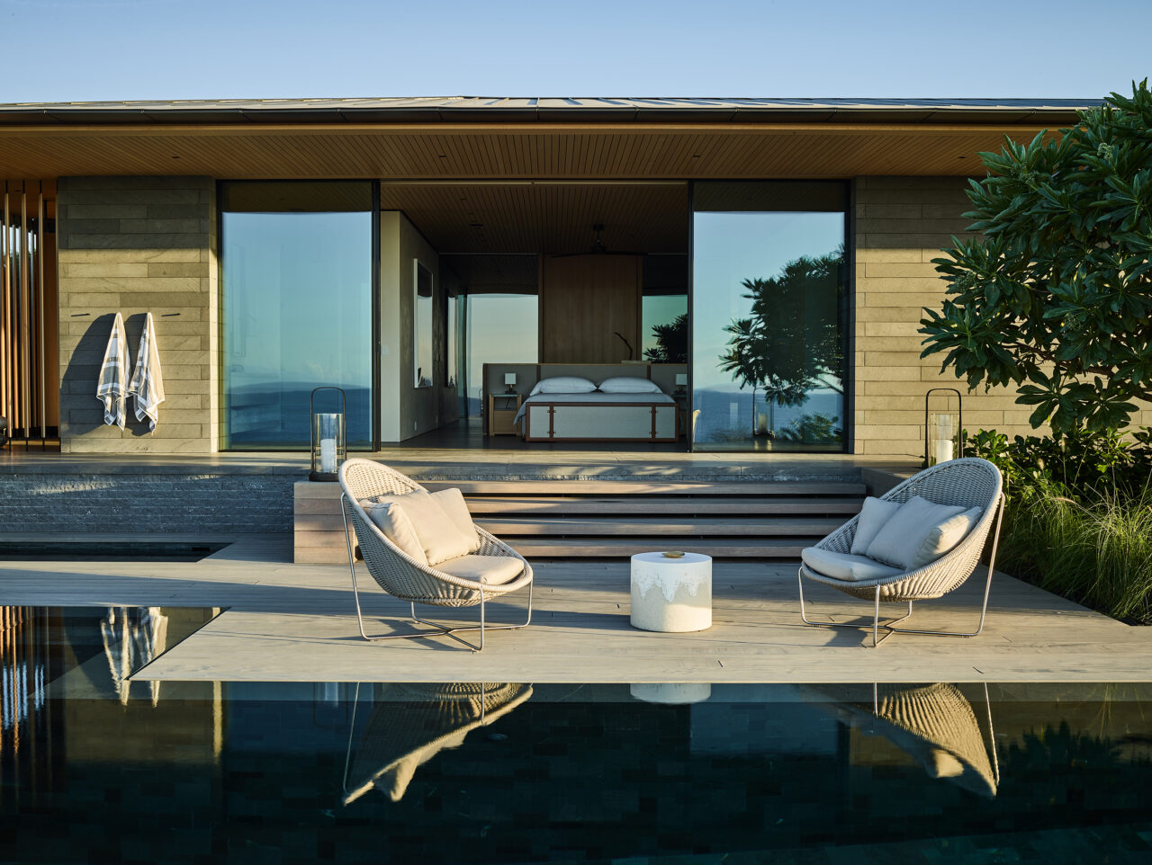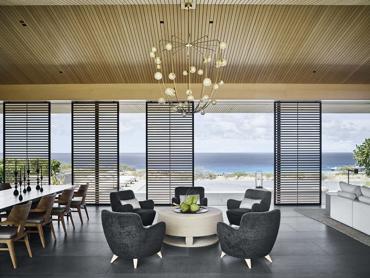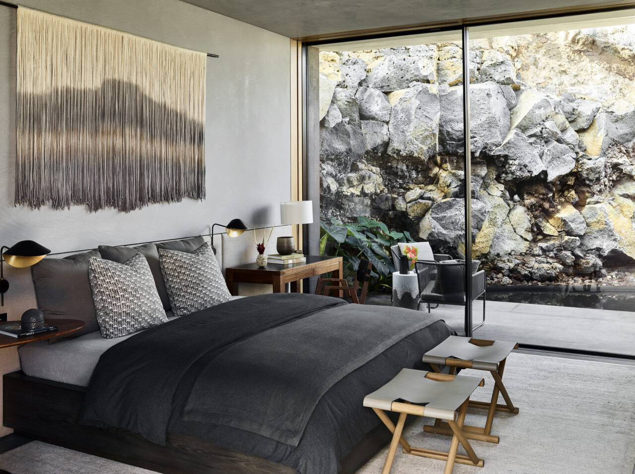 Blending the line between inside and outside, the courtyard is framed by a raised tree bosquet and lava outcrops mirrored by a series of reflecting ponds. The courtyard serves as a private gathering space shielded from trade winds where guests can take in and appreciate the views of the mountains and the sea.