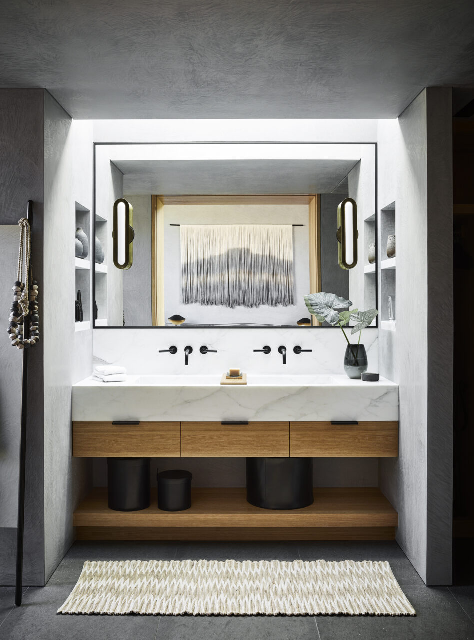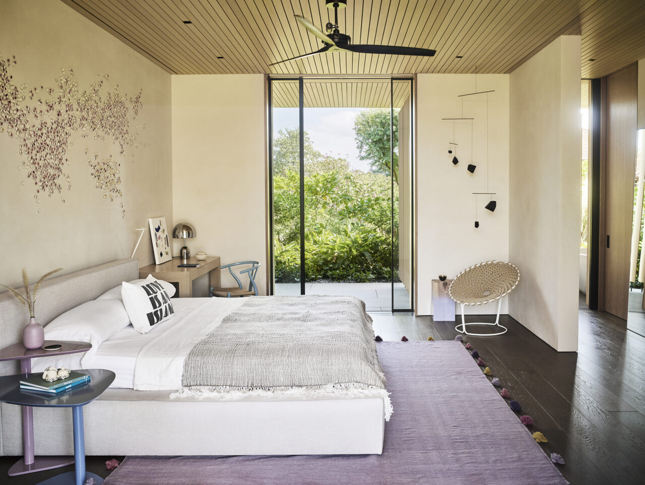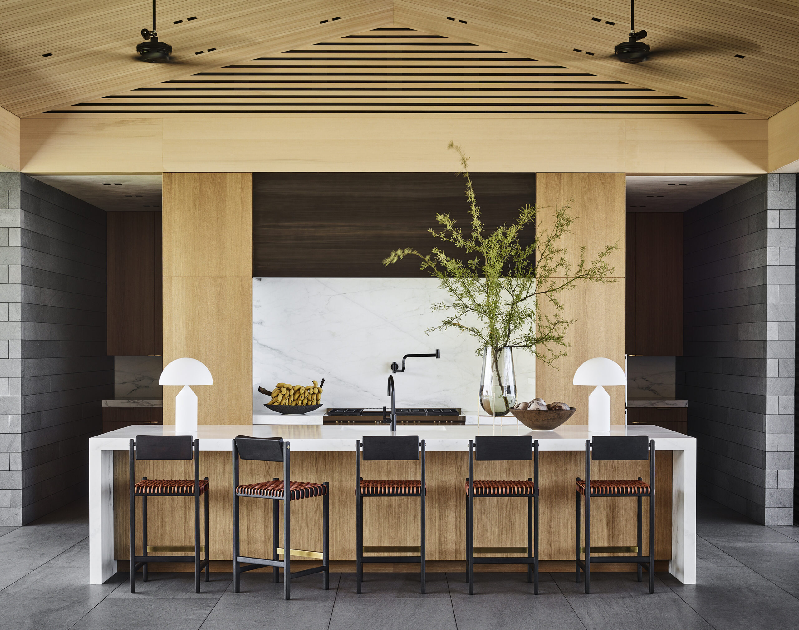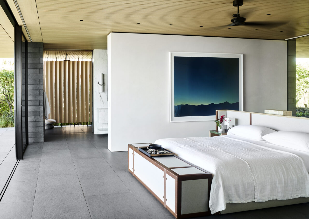 Blending the line between inside and outside, the courtyard is framed by a raised tree bosquet and lava outcrops mirrored by a series of reflecting ponds. The courtyard serves as a private gathering space shielded from trade winds where guests can take in and appreciate the views of the mountains and the sea.