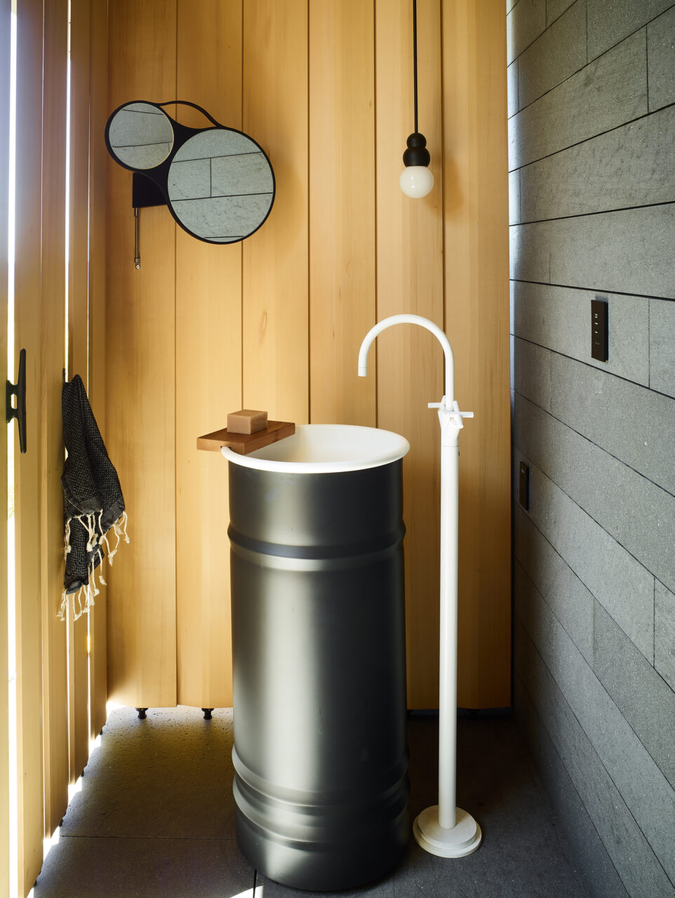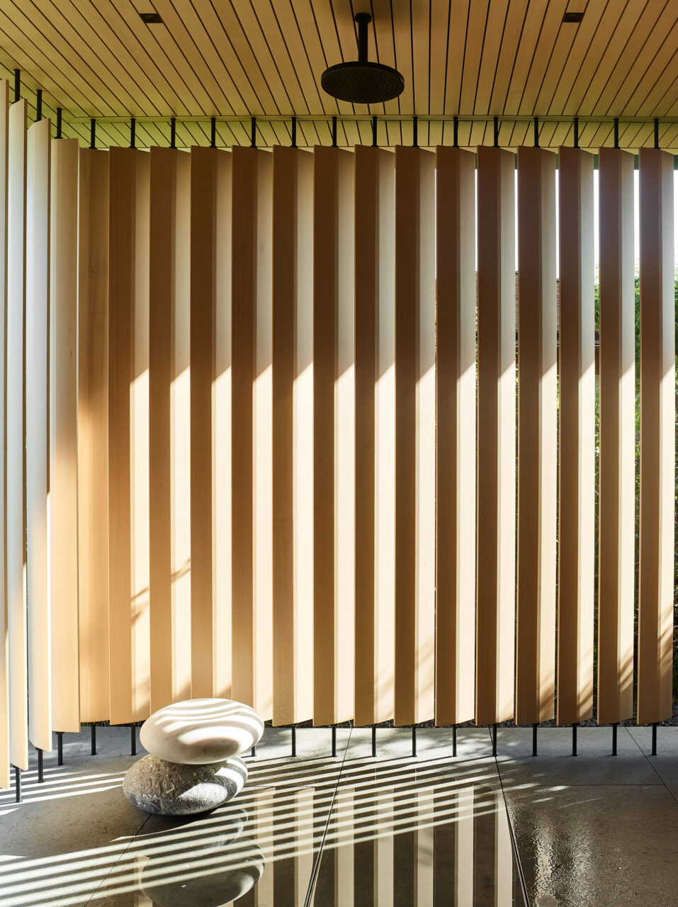 The guest hale on the mountain side of the property places an emphasis on the natural beauty of the layered lava formations. To create a sense of seclusion and privacy, decorative corten pickets enclose a furnished entry courtyard, while the living roof helps the building discreetly blend into the rugged landscape. As you enter the guest bedroom suites, the focal point of the experience becomes a striking outdoor lava grotto space, deliberately pulled away from the building to create a sophisticated and moody private outdoor terrace where guests can admire the beauty of the natural lava and bathe in privacy.