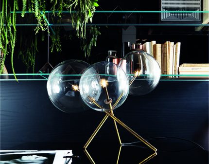 Table lamp with halogen light point (60 watts). Spheres in transparent handblown glass and burnished brass pieces also by hand. The Brass is naturally stained and uneven. The hand-craftsmanship gives each piece a particular uniqueness, making it exclusive. Bolle Tavolo 3 is part of a “Bolle” lighting range by Gallotti & Radice.