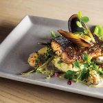 - Pan fried seabass, creamy mash potatoes, wilted greens and mussel veloute