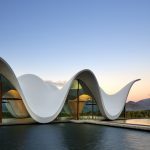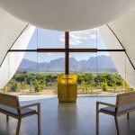 Inspired by the scriptures of Psalm 36:7, the chapel has a serene sculptural form that emulates the silhouette of the surrounding Slanghoek and Waaihoek mountain ranges, paying tribute to the Cape Dutch gables found in the rural landscapes of the Western Cape. Constructed from a slim concrete cast shell, the roof supports itself as each undulation dramatically falls to meet the ground. Surrounded by meditative gardens, the glass-walled chapel’s flowing white roof appears to float serenely in a reflection pond.
