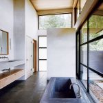 The taller section runs along the ridge of the hill and houses the home’s great room. Under lofty ceilings and a simple shed overhanging roof, it’s filled with light and vistas seen through the tall glass walls. Four oversized glass panels open dramatically on each side, transforming the space into an outdoor pavilion whose flush concrete floors extend into a poolside patio to the north and a terrace featuring a fire pit to the south; this provides comfortable outdoor areas for both warm and cool weather. With these doors drawn up, the site offers one sweeping, continuous view from the pool, through the great room, and down into the distant village below.