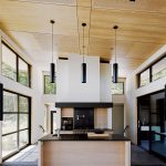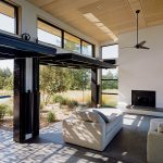 Says the architect: ‘The client wanted an indoor / outdoor connection, which was achieved by installing the unique, vertical and counterbalanced lift doors by Renlita. The main doors tilt outward and fold back into the ceiling, allowing for the landscape to fully enter the space.’