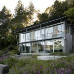 In order to preserve the elegant quality of the desired ‘glass house’, the structure here is expressed on the exterior. Round steel columns stretch upwards across two stories to support the sunshade and thin corrugated metal roof; balancing modern lines with delicate panes of glass. Two monolithic concrete forms at the East and West facades provide both structure and storage while visually anchoring the building to the site.